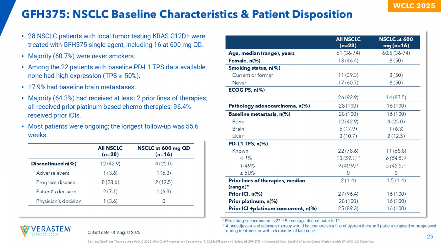 24 Duration of Treatment and Tumor Assessment of All Patients Month Data cut - off date: 16 May 2025 All patients received first dose of GFH375 at least 10 weeks prior to data cutoff date. The y - axis tick label is tumor type and number of prior lines of therapies. Abbreviations: NE, not evaluable; PD, progressive disease; PR, p artial response; SD, stable disease. • Median (range) time on treatment: 11.8 weeks (range: 0.1 - 42.1) • Median (range) time to response: 6.2 weeks (range: 6.0 - 24.7) • 36 out of 62 patients are ongoing with treatment Source: GenFleet Therapeutics ASCO 2025 Rapid Oral Presentation June 2, 2025; A First - in - human Phase I/II Study of GFH375, a Highly Selective an d Potent Oral KRAS G12D Inhibitor in Patients in KRAS G12D Mutant Advanced Solid Tumors ASCO 2025