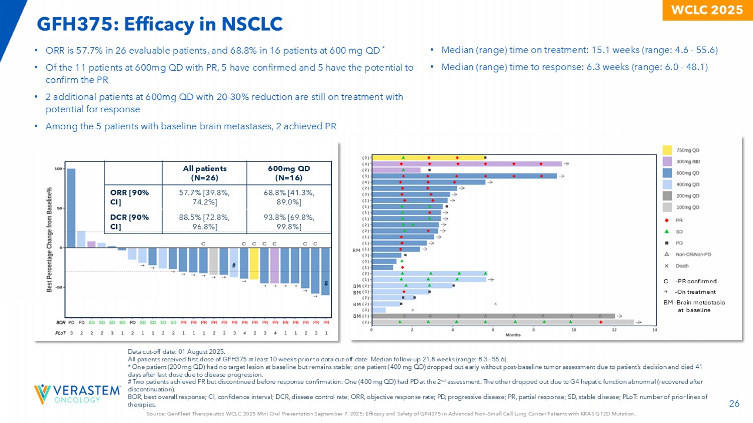 25 Source: GenFleet Therapeutics WCLC 2025 Mini Oral Presentation September 7. 2025; Efficacy and Safety of GFH375 in Advanced N on - Small Cell Lung Cancer Patients with KRAS G12D Mutation. WCLC 2025 Cut - off date: 01 August 2025. NSCLC at 600 mg QD (n=16) All NSCLC (n=28) 4 (25.0) 12 (42.9) Discontinued n(%) 1 (6.3) 1 (3.6) Adverse event 2 (12.5) 8 (28.6) Progress disease 1 (6.3) 2 (7.1) Patient’s decision 0 1 (3.6) Physician’s decision • 28 NSCLC patients with local tumor testing KRAS G12D+ were treated with GFH375 single agent, including 16 at 600 mg QD. • Majority (60.7%) were never smokers. • Among the 22 patients with baseline PD - L1 TPS data available, none had high expression (TPS ≥ 50%). • 17.9% had baseline brain metastases. • Majority (64.3%) had received at least 2 prior lines of therapies; all received prior platinum - based chemo therapies; 96.4% received prior ICIs. • Most patients were ongoing; the longest follow - up was 55.6 weeks. NSCLC at 600 mg (n=16) All NSCLC (n=28) 60.5 (36 - 74) 61 (36 - 74) Age, median (range), years 8 (50) 13 (46.4) Female, n(%) Smoking status, n(%) 8 (50) 11 (39.3) Current or former 8 (50) 17 (60.7) Never ECOG PS, n(%) 14 (87.5) 26 (92.9) 1 16 (100) 28 (100) Pathology adenocarcinoma, n(%) 16 (100) 28 (100) Baseline metastasis, n(%) 4 (25.0) 12 (42.9) Bone 1 (6.3) 5 (17.9) Brain 2 (12.5) 3 (10.7) Liver PD - L1 TPS, n(%) 11 (68.8) 22 (78.6) Known 6 (54.5) 2 13 (59.1) 1 < 1% 5 (45.5) 2 9 (40.9) 1 1 - 49% 0 0 ≥ 50% 1.5 (1 - 4) 2 (1 - 4) Prior lines of therapies, median (range) * 16 (100) 27 (96.4) Prior ICI, n(%) 16 (100) 28 (100) Prior platinum, n(%) 16 (100) 25 (89.3) Prior ICI +platinum concurrent, n(%) 1 Percentage denominator is 22. 2 Percentage denominator is 11. * A neoadjuvant and adjuvant therapy would be counted as a line of system therapy if patient relapsed or progressed during treatment or within 6 months of last dose. GFH375: NSCLC Baseline Characteristics & Patient Disposition