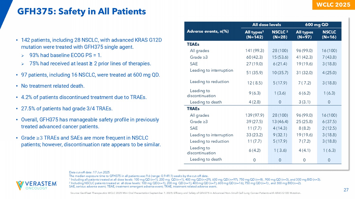 26 Source: GenFleet Therapeutics WCLC 2025 Mini Oral Presentation September 7. 2025; Efficacy and Safety of GFH375 in Advanced N on - Small Cell Lung Cancer Patients with KRAS G12D Mutation. WCLC 2025 600mg QD (N=16) All patients (N=26) 68.8% [41.3%, 89.0%] 57.7% [39.8%, 74.2%] ORR [90% CI] 93.8% [69.8%, 99.8%] 88.5% [72.8%, 96.8%] DCR [90% CI] • ORR is 57.7% in 26 evaluable patients, and 68.8% in 16 patients at 600 mg QD * • Of the 11 patients at 600mg QD with PR, 5 have confirmed and 5 have the potential to confirm the PR • 2 additional patients at 600mg QD with 20 - 30% reduction are still on treatment with potential for response • Among the 5 patients with baseline brain metastases, 2 achieved PR # # • Median (range) time on treatment: 15.1 weeks (range: 4.6 - 55.6) • Median (range) time to response: 6.3 weeks (range: 6.0 - 48.1) C - PR confirmed → - On treatment BM - Brain metastasis at baseline BM BM BM BM BM Data cut - off date: 01 August 2025. All patients received first dose of GFH375 at least 10 weeks prior to data cut - off date. Median follow - up 21.8 weeks (range: 8.3 - 55.6). * One patient (200 mg QD) had no target lesion at baseline but remains stable; one patient (400 mg QD) dropped out early with out post - baseline tumor assessment due to patient’s decision and died 41 days after last dose due to disease progression. # Two patients achieved PR but discontinued before response confirmation. One (400 mg QD) had PD at the 2 nd assessment. The other dropped out due to G4 hepatic function abnormal (recovered after discontinuation). BOR, best overall response; CI, confidence interval; DCR, disease control rate; ORR, objective response rate; PD, progressive di sease; PR, partial response; SD, stable disease; PLoT : number of prior lines of therapies. GFH375: Efficacy in NSCLC