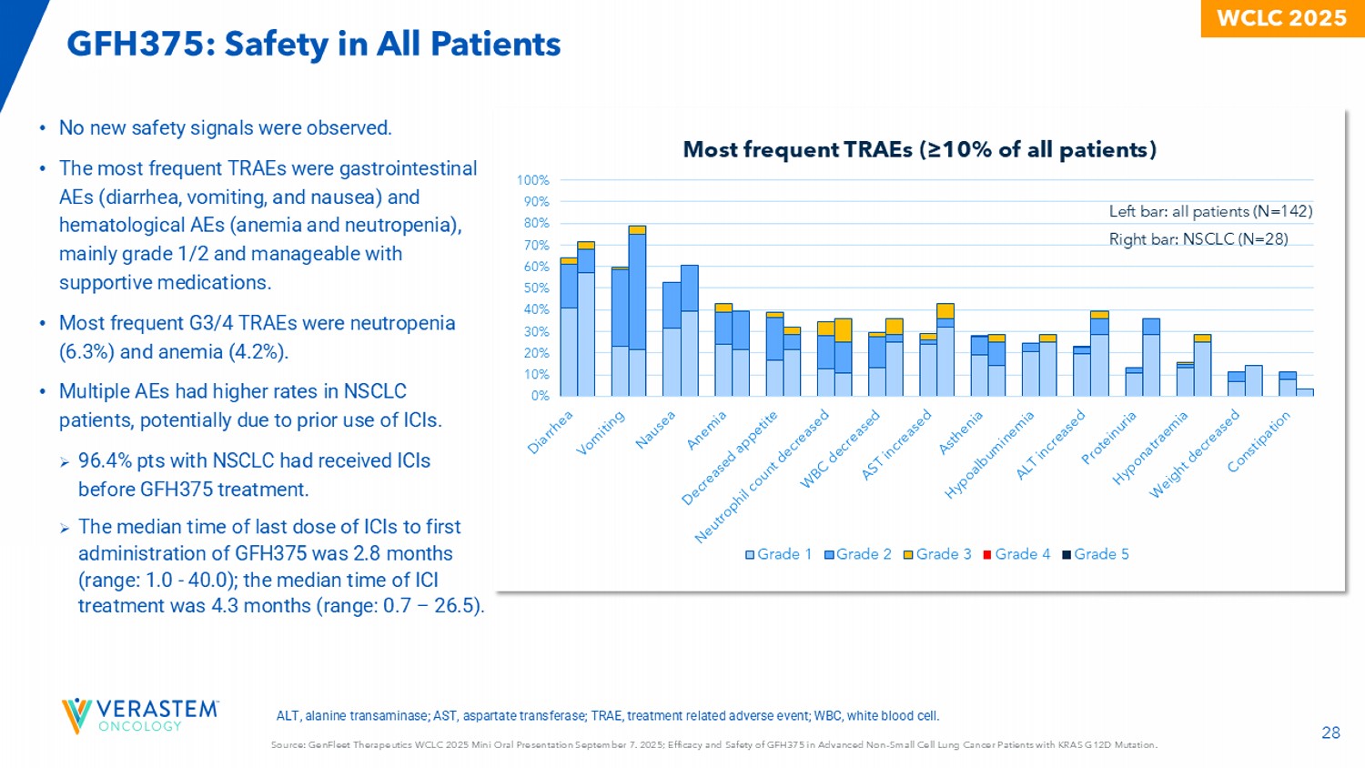 27 WCLC 2025 GFH375: Safety in All Patients Source: GenFleet Therapeutics WCLC 2025 Mini Oral Presentation September 7. 2025; Efficacy and Safety of GFH375 in Advanced N on - Small Cell Lung Cancer Patients with KRAS G12D Mutation. • 142 patients, including 28 NSCLC, with advanced KRAS G12D mutation were treated with GFH375 single agent. » 93% had baseline ECOG PS = 1. » 75% had received at least ≥ 2 prior lines of therapies. • 97 patients, including 16 NSCLC, were treated at 600 mg QD. • No treatment related death. • 4.2% of patients discontinued treatment due to TRAEs. • 27.5% of patients had grade 3/4 TRAEs. • Overall, GFH375 has manageable safety profile in previously treated advanced cancer patients. • Grade ≥3 TRAEs and SAEs are more frequent in NSCLC patients; however, discontinuation rate appears to be similar. 600 mg QD All dose levels Adverse events, n(%) NSCLC (N=16) All types (N=97) NSCLC 2 (N=28) All types 1 (N=142) TEAEs 16 (100) 96 (99.0) 28 (100) 141 (99.3) All grades 7 (43.8) 41 (42.3) 15 (53.6) 60 (42.3) Grade ≥ 3 3 (18.8) 19 (19.6) 6 (21.4) 27 (19.0) SAE 4 (25.0) 31 (32.0) 10 (35.7) 51 (35.9) Leading to interruption 3 (18.8) 7 ( 7.2) 5 (17.9) 12 ( 8.5) Leading to reduction 1 (6.3) 6 (6.2) 1 (3.6) 9 (6.3) Leading to discontinuation 0 3 (3.1) 0 4 (2.8) Leading to death TRAEs 16 (100) 96 (99.0) 28 (100) 139 (97.9) All grades 6 (37.5) 25 (25.8) 13 (46.4) 39 (27.5) Grade ≥ 3 2 (12.5) 8 (8.2) 4 (14.3) 11 (7.7) SAE 3 (18.8) 19 (19.6) 9 (32.1) 33 (23.2) Leading to interruption 3 (18.8) 7 (7.2) 5 (17.9) 11 (7.7) Leading to reduction 1 ( 6.3) 4 (4.1) 1 ( 3.6) 6 (4.2) Leading to discontinuation 0 0 0 0 Leading to death Data c ut - off date: 17 Jun 2025 The median exposure time to GFH375 in all patients was 9.6 (range: 0.9 - 49.1) week s by the cut - off date. 1 Including all patients treated at all dose levels: 100 mg QD (n=1), 200 mg QD (n=1), 400 mg QD (n=29), 600 mg QD (n=97), 750 m g QD (n=8) , 900 mg QD (n=3), and 300 mg BID (n=3). 2 Including NSCLC patients treated at all dose levels: 100 mg QD (n=1), 200 mg QD (n=1), 400 mg QD (n=7), 600 mg QD (n=16), 7 50 mg QD (n=1) , and 300 mg BID (n=2). SAE, serious adverse event; TEAE, treatment emergent adverse event; TRAE, treatment related adverse event.