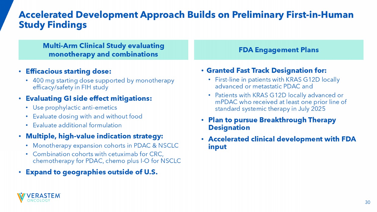 29 VS - 7375 - 101 Study Schema, Efficiently Testing KRAS G12D+ Indications with Monotherapy and SOC Combinations Part A: Single Agent Dose Escalation – Any KRAS G12D Solid Tumor Cohort B1: 2L+ PDAC (N=20) Cohort D1: 2L+ CRC Cetuximab (N=20) VS - 7375 + Combinations Part B: Dose Expansion Part C: Combination Dose Escalations Part D: Combination Dose Expansion Dose Level 3: 900 mg QD Dose Level 2: 600 mg QD Dose Level 1: 400 mg QD Dose Level - 1 : 300 mg QD Cohort B2: 2L+ NSCLC (N=20) Cohort B3: 2L+ Solid Tumors (N=20) VS - 7375 Dose Escalation Anticipated dose levels range from 400 - 900 mg QD, with options for reduction if required. + Cohort C1: 2L+ Solid Tumors Cetuximab* Cohort D2: 1L NSCLC Carboplatin/Pemetrexed/ Pembrolizumab (N=20) Select RP2D Select RP2D Cohort C3: 2L+ PDAC Gemcitabine + Nab - Paclitaxel Cohort D3: 2L+ PDAC Gemcitabine/Nab - Paclitaxel (N=20) Select RP2D Select RP2D Cohort C4: 1L PDAC – 75+ yo Gemcitabine Cohort D4: 1L PDAC – 75+ yo Gemcitabine (N=20) Select RP2D Cohort C2: 1L NSCLC Carboplatin/Pemetrexed/Pembrolizum ab The study will evaluate dosing with meals and utilize prophylactic anti - emetics *Anticipated starting dose level for cetuximab combination once the monotherapy clears 600 mg dose level VS - 7375 Monotherapy