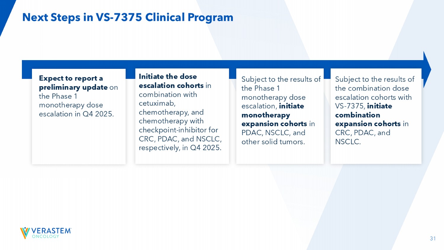31 Next Steps in VS - 7375 Clinical Program Expect to report a preliminary update on the Phase 1 monotherapy dose escalation in Q4 2025. ௗ Subject to the results of the Phase 1 monotherapy dose escalation, initiate monotherapy expansion cohorts in PDAC, NSCLC, and other solid tumors. Initiate the dose escalation cohorts in combination with cetuximab, chemotherapy, and chemotherapy with checkpoint - inhibitor for CRC, PDAC, and NSCLC, respectively, in Q4 2025. Subject to the results of the combination dose escalation cohorts with VS - 7375, initiate combination expansion cohorts in CRC, PDAC, and NSCLC.