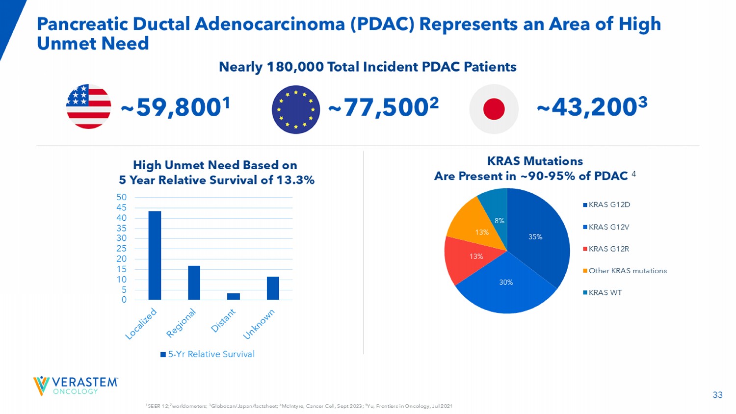 33 1 SEER 12; 2 worldometers; 3 Globocan/Japan/factsheet; 4 McIntyre, Cancer Cell, Sept 2023; 5 Yu, Frontiers in Oncology, Jul 2021 Pancreatic Ductal Adenocarcinoma (PDAC) Represents an Area of High Unmet Need 0 5 10 15 20 25 30 35 40 45 50 5-Yr Relative Survival KRAS Mutations Are Present in ~90 - 95% of PDAC 4 High Unmet Need Based on 5 Year Relative Survival of 13.3% Nearly 180,000 Total Incident PDAC Patients 35% 30% 13% 13% 8% KRAS G12D KRAS G12V KRAS G12R Other KRAS mutations KRAS WT ~59,800 1 ~43,200 3 ~77,500 2