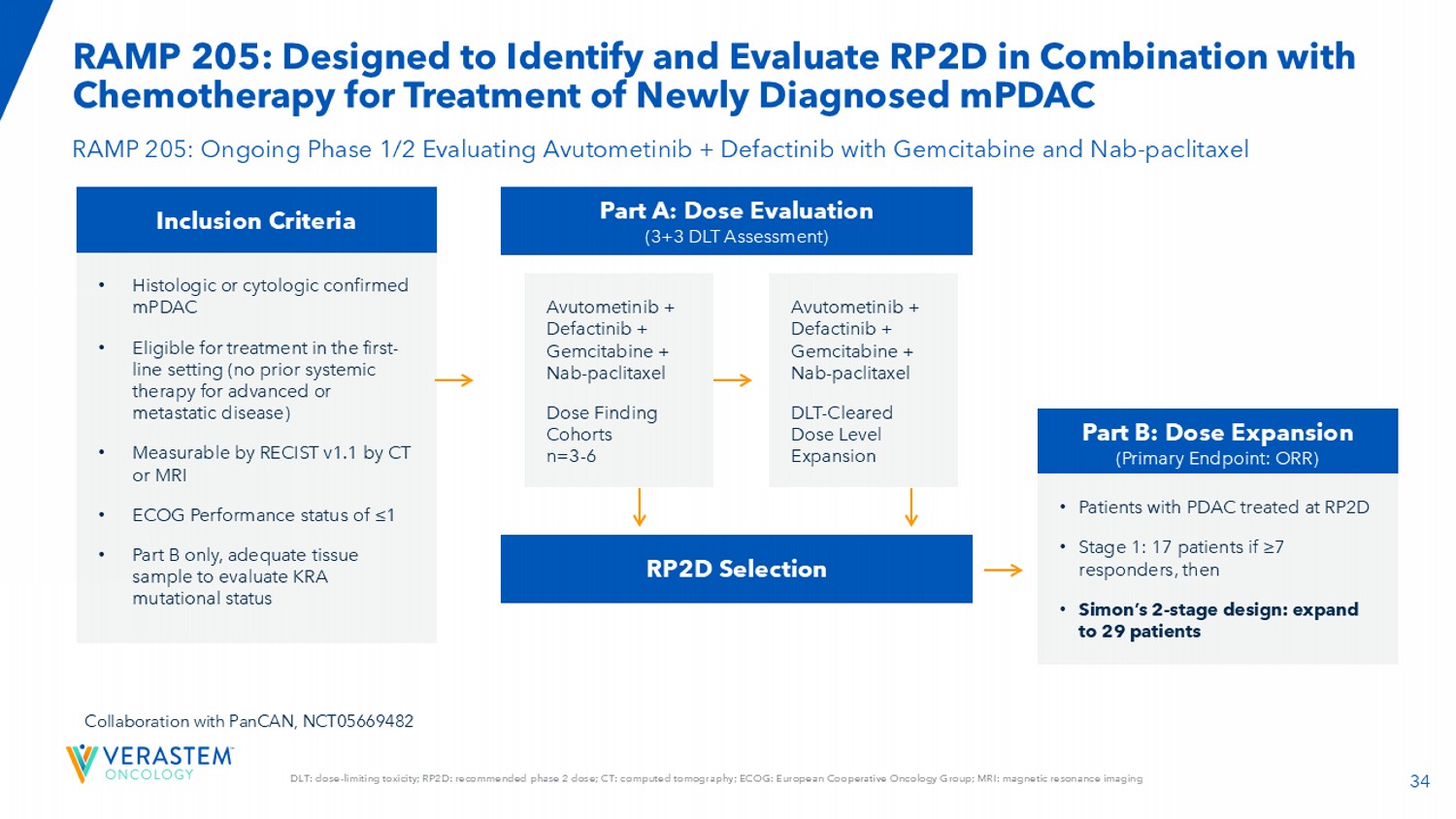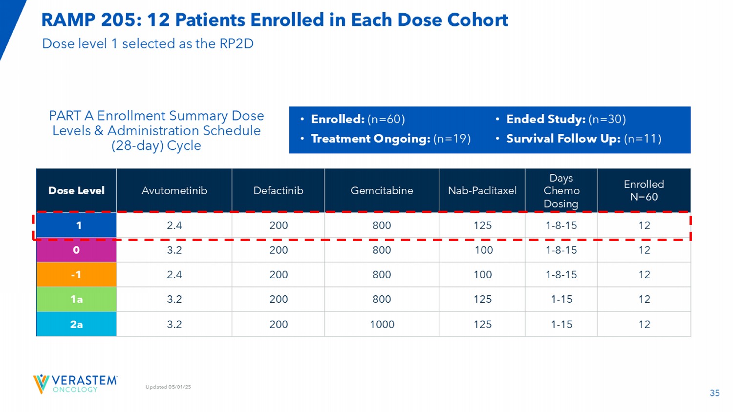 34 DLT: dose - limiting toxicity; RP2D: recommended phase 2 dose; CT: computed tomography; ECOG: European Cooperative Oncology Group; MRI: magnetic resonance imaging RAMP 205: Designed to Identify and Evaluate RP2D in Combination with Chemotherapy for Treatment of Newly Diagnosed mPDAC RAMP 205: Ongoing Phase 1/2 Evaluating Avutometinib + Defactinib with Gemcitabine and Nab - paclitaxel Inclusion Criteria • Histologic or cytologic confirmed mPDAC • Eligible for treatment in the first - line setting (no prior systemic therapy for advanced or metastatic disease) • Measurable by RECIST v1.1 by CT or MRI • ECOG Performance status of ≤1 • Part B only, adequate tissue sample to evaluate KRA mutational status Collaboration with PanCAN , NCT05669482 Part A: Dose Evaluation (3+3 DLT Assessment) RP2D Selection Part B: Dose Expansion (Primary Endpoint: ORR) Avutometinib + Defactinib + Gemcitabine + Nab - paclitaxel Dose Finding Cohorts n=3 - 6 Avutometinib + Defactinib + Gemcitabine + Nab - paclitaxel DLT - Cleared Dose Level Expansion • Patients with PDAC treated at RP2D • Stage 1: 17 patients if ≥7 responders, then • Simon’s 2 - stage design: expand to 29 patients