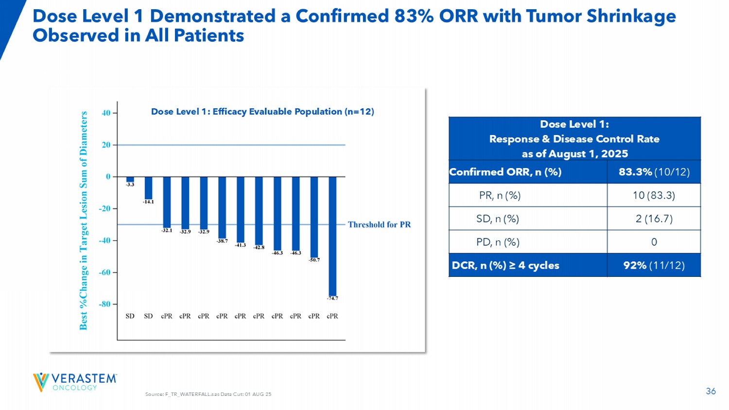 36 Source: F_TR_WATERFALL.sas Data Cut: 01 AUG 25 Dose Level 1 Demonstrated a Confirmed 83% ORR with Tumor Shrinkage Observed in All Patients Dose Level 1: Response & Disease Control Rate as of August 1, 2025 83.3% ( 10/12) Confirmed ORR, n (%) 10 (83.3) PR, n (%) 2 (16.7) SD, n (%) 0 PD, n (%) 92% (11/12 ) DCR, n (%) ≥ 4 cycles Dose Level 1: Efficacy Evaluable Population (n=12)