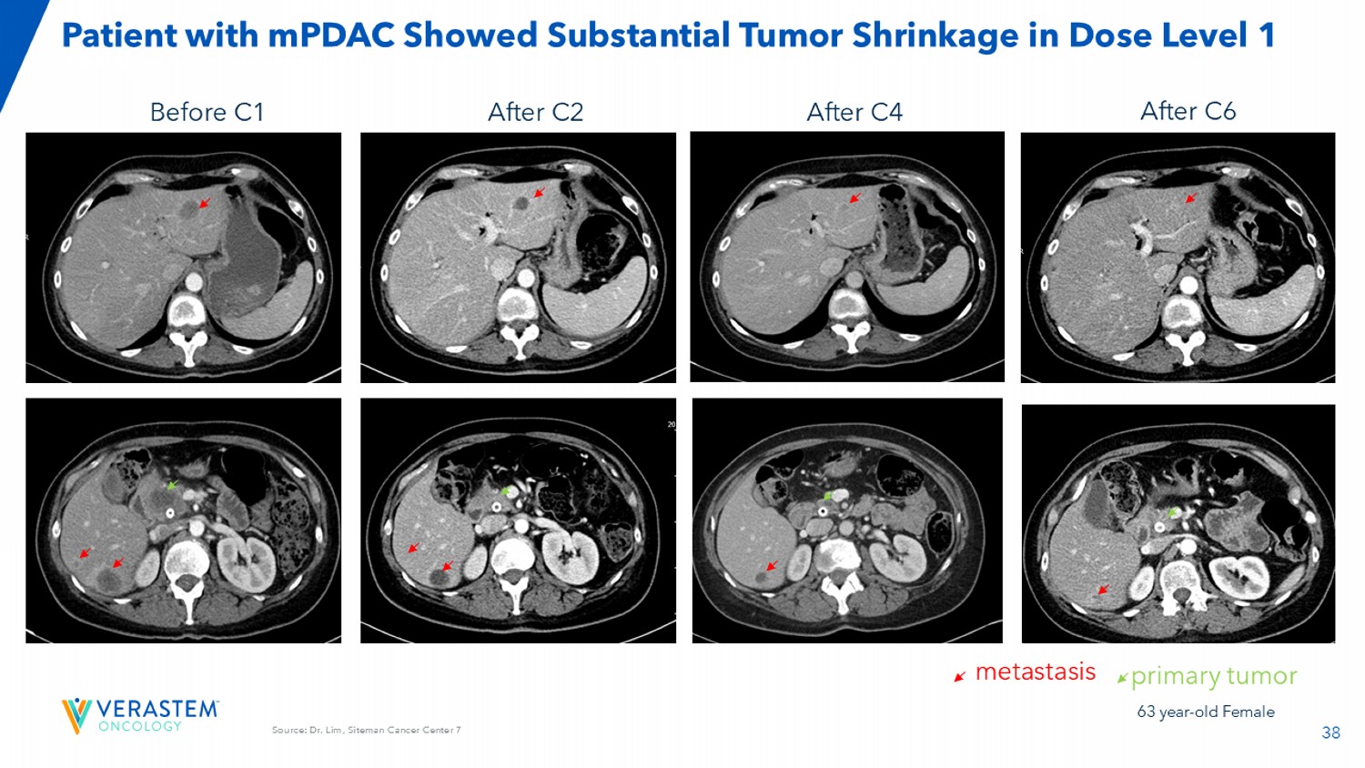 38 Source: Dr. Lim, Siteman Cancer Center 7 Patient with mPDAC Showed Substantial Tumor Shrinkage in Dose Level 1 Before C1 After C2 After C4 After C6 metastasis primary tumor 63 year - old Female