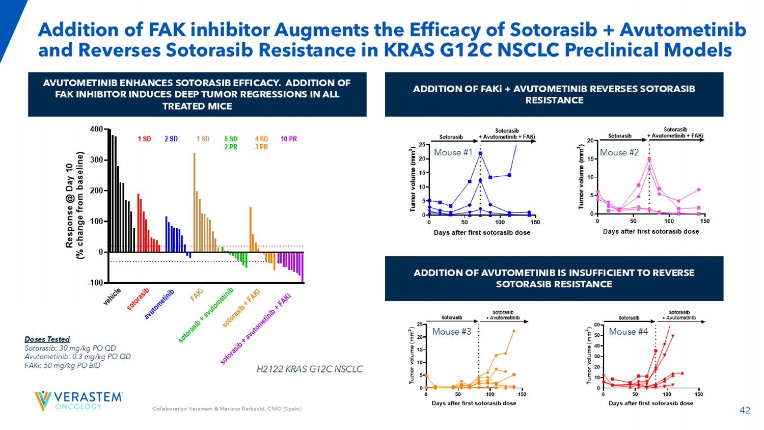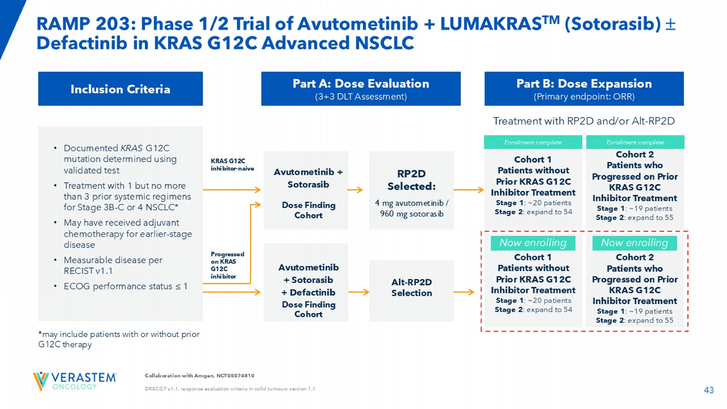 42 Collaboration Verastem & Mariano Barbacid , CNIO (Spain) Addition of FAK inhibitor Augments the Efficacy of Sotorasib + Avutometinib and Reverses Sotorasib Resistance in KRAS G12C NSCLC Preclinical Models AVUTOMETINIB ENHANCES SOTORASIB EFFICACY. ADDITION OF FAK INHIBITOR INDUCES DEEP TUMOR REGRESSIONS IN ALL TREATED MICE ADDITION OF FAKi + AVUTOMETINIB REVERSES SOTORASIB RESISTANCE ADDITION OF AVUTOMETINIB IS INSUFFICIENT TO REVERSE SOTORASIB RESISTANCE -100 0 100 200 300 400 Response at Day 10 R e s p o n s e @ D a y 1 0 ( % c h a n g e f r o m b a s e l i n e ) v e h i c l e 10 PR a v u t o m e t i n i b F A K i s o t o r a s i b s o t o r a s i b + a v u t o m e t i n i b s o t o r a s i b + F A K i s o t o r a s i b + a v u t o m e t i n i b + F A K i 2 SD 1 SD1 SD 8 SD 2 PR 4 SD 3 PR Doses Tested Sotorasib : 30 mg/kg PO QD Avutometinib : 0.3 mg/kg PO QD FAKi : 50 mg/kg PO BID H2122 KRAS G12C NSCLC 0 50 100 150 0 5 10 15 20 25 Days after first sotorasib dose T u m o r v o l u m e ( m m 3 ) Sotorasib + Avutometinib + FAKiSotorasib 0 50 100 150 0 5 10 15 20 25 Days after first sotorasib dose T u m o r v o l u m e ( m m 3 ) Sotorasib + Avutometinib Sotorasib Mouse #1 Mouse #2 Mouse #3 Mouse #4