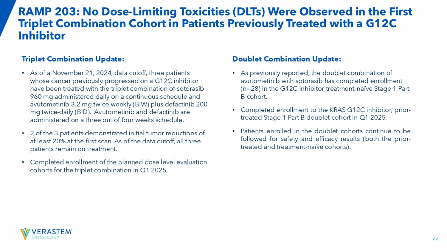 44 RAMP 203: No Dose - Limiting Toxicities (DLTs) Were Observed in the First Triplet Combination Cohort in Patients Previously Treated with a G12C Inhibitor Triplet Combination Update: • As of a November 21, 2024, data cutoff, three patients whose cancer previously progressed on a G12C inhibitor have been treated with the triplet combination of sotorasib 960 mg administered daily on a continuous schedule and avutometinib 3.2 mg twice - weekly (BIW) plus defactinib 200 mg twice - daily (BID). Avutometinib and defactinib are administered on a three out of four weeks schedule. • 2 of the 3 patients demonstrated initial tumor reductions of at least 20% at the first scan. As of the data cutoff, all three patients remain on treatment. • Completed enrollment of the planned dose level evaluation cohorts for the triplet combination in Q1 2025. Doublet Combination Update: • As previously reported, the doublet combination of avutometinib with sotorasib has completed enrollment (n=28) in the G12C inhibitor treatment - naïve Stage 1 Part B cohort. • Completed enrollment to the KRAS G 12 C inhibitor, prior - treated Stage 1 Part B doublet cohort in Q 1 2025 . • Patients enrolled in the doublet cohorts continue to be followed for safety and efficacy results (both the prior - treated and treatment - naïve cohorts) .