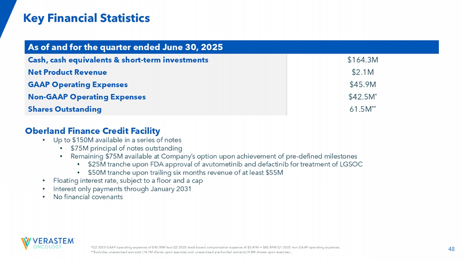 48 *Q2 2025 GAAP operating expenses of $45.90M less Q2 2025 stock - based compensation expense of $3.41M = $42.49M Q1 2025 non - GAAP o perating expenses. **Excludes unexercised warrants (14.1M shares upon exercise) and unexercised pre - funded warrants (9.8M shares upon exercise) . Key Financial Statistics As of and for the quarter ended June 30, 2025 $164.3M Cash, cash equivalents & short - term investments $2.1M Net Product Revenue $45.9M GAAP Operating Expenses $42.5M * Non - GAAP Operating Expenses 61.5M ** Shares Outstanding Oberland Finance Credit Facility • Up to $150M available in a series of notes • $75M principal of notes outstanding • Remaining $75M available at Company’s option upon achievement of pre - defined milestones • $25M tranche upon FDA approval of avutometinib and defactinib for treatment of LGSOC • $50M tranche upon trailing six months revenue of at least $55M • Floating interest rate, subject to a floor and a cap • Interest only payments through January 2031 • No financial covenants