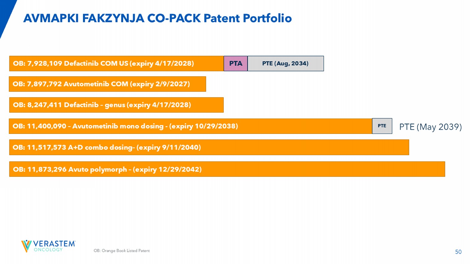 50 OB: Orange Book Listed Patent AVMAPKI FAKZYNJA CO - PACK Patent Portfolio OB: 7,897,792 Avutometinib COM (expiry 2/9/2027) OB: 11,400,090 – Avutometinib mono dosing - (expiry 10/29/2038) PTE OB: 7,928,109 Defactinib COM US (expiry 4/17/2028) PTA PTE (Aug, 2034) OB: 8,247,411 Defactinib – genus (expiry 4/17/2028) OB: 11,517,573 A+D combo dosing – (expiry 9/11/2040) OB: 11,873,296 Avuto polymorph – (expiry 12/29/2042) PTE (May 2039)