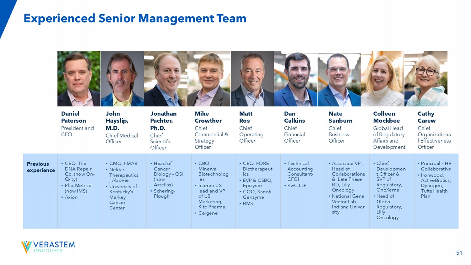 51 Experienced Senior Management Team Cathy Carew Chief Organizationa l Effectiveness Officer Colleen Mockbee Global Head of Regulatory Affairs and Development Nate Sanburn Chief Business Officer Dan Calkins Chief Financial Officer Matt Ros Chief Operating Officer Mike Crowther Chief Commercial & Strategy Officer Jonathan Pachter, Ph.D. Chief Scientific Officer John Hayslip, M.D. Chief Medical Officer Daniel Paterson President and CEO • Principal – HR Collaborative • Ironwood, ActiveBiotics , Dynogen , Tufts Health Plan • Chief Developmen t Officer & SVP of Regulatory, OncXerna • Head of Global Regulatory, Lilly Oncology • Associate VP, Head of Collaborations & Late Phase BD, Lilly Oncology • National Gene Vector Lab, Indiana Univer sity • Technical Accounting Consultant - CFGI • PwC LLP • CEO, FORE Biotherapeut ics • EVP & CSBO, Epizyme • COO, Sanofi - Genzyme • BMS • CBO, Minerva Biotechnolog ies • Interim US lead and VP of US Marketing, Kite Pharma • Celgene • Head of Cancer Biology – OSI (now Astellas) • Schering - Plough • CMO, I - MAB • Nektar Therapeutics , AbbVie • University of Kentucky’s Markey Cancer Center • CEO, The DNA Repair Co. (now On - Q - ity ) • PharMetrics (now IMS) • Axion Previous experience