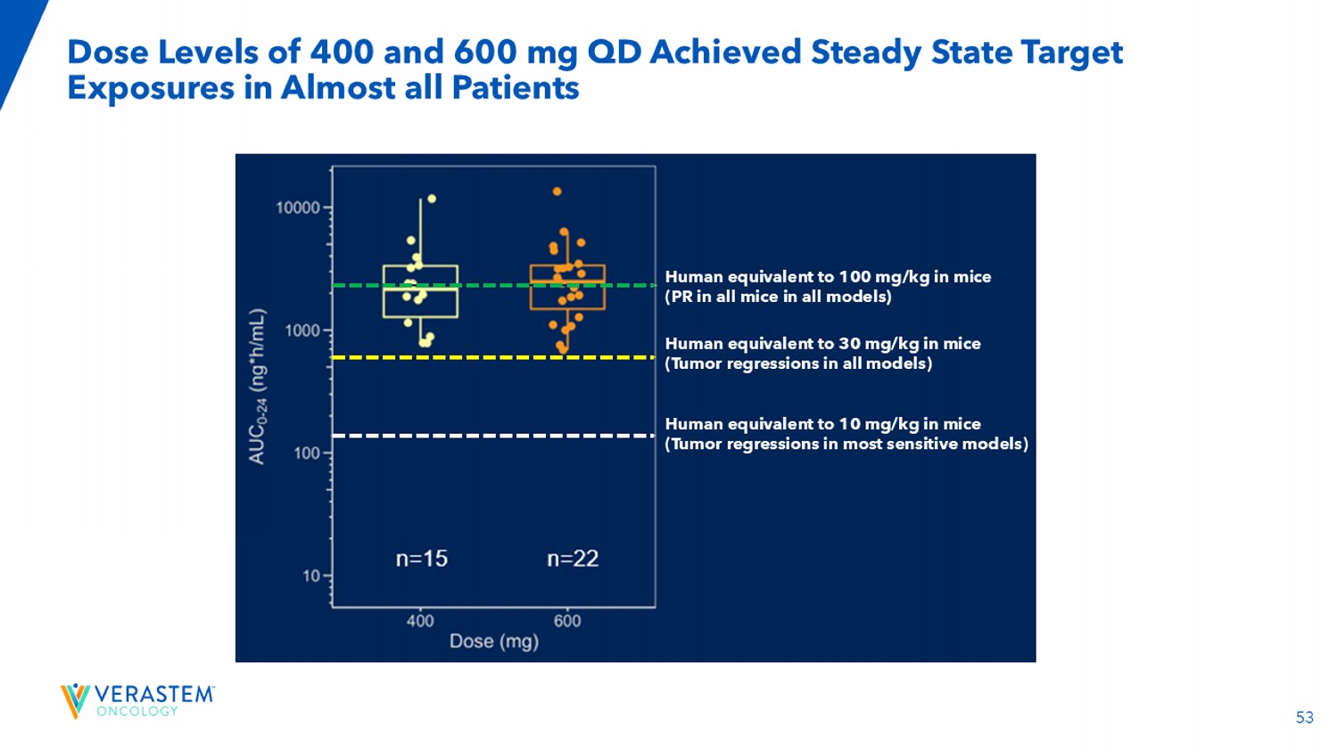 53 Dose Levels of 400 and 600 mg QD Achieved Steady State Target Exposures in Almost all Patients Human equivalent to 100 mg/kg in mice (PR in all mice in all models) Human equivalent to 30 mg/kg in mice (Tumor regressions in all models) Human equivalent to 10 mg/kg in mice (Tumor regressions in most sensitive models)