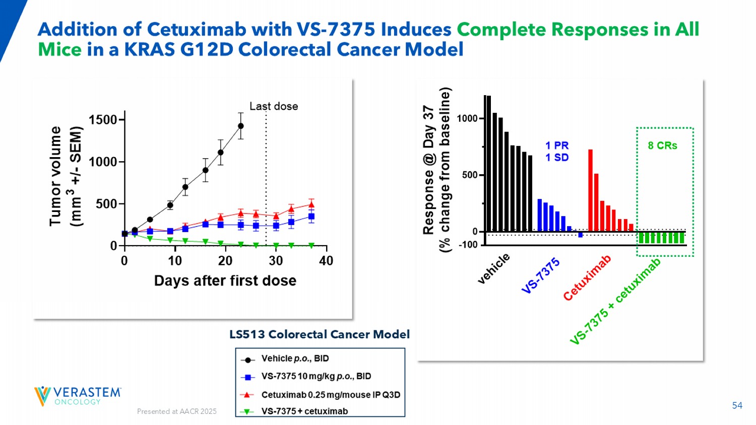 54 Addition of Cetuximab with VS - 7375 Induces Complete Responses in All Mice in a KRAS G12D Colorectal Cancer Model LS513 Colorectal Cancer Model 0 10 20 30 40 0 500 1000 1500 Tumor growth Days after first dose T u m o r v o l u m e ( m m 3 + / - S E M ) Vehicle GFH375 Cetuximab GFH375 + cetuximab Last dose 0 500 1000 R e s p o n s e @ D a y 3 7 ( % c h a n g e f r o m b a s e l i n e ) v e h i c l e V S - 7 3 7 5 C e t u x i m a b V S - 7 3 7 5 + c e t u x i m a b 1 PR 1 SD 8 CRs -100 Presented at AACR 2025