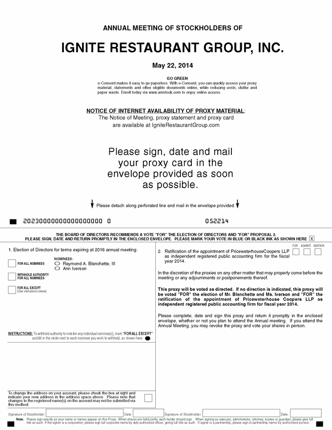 ANNUAL MEETING OF STOCKHOLDERS OF IGNITE RESTAURANT GROUP, INC. May 22, 2014 NOTICE OF INTERNET AVAILABILITY OF PROXY MATERIAL: The Notice of Meeting, proxy statement and proxy card are available at IgniteRestaurantGroup.com Please sign, date and mail your proxy card in the envelope provided as soon as possible. Signature of Stockholder Date: Signature of Stockholder Date: Note: Please sign exactly as your name or names appear on this Proxy. When shares are held jointly, each holder should sign. When signing as executor, administrator, attorney, trustee or guardian, please give full title as such. If the signer is a corporation, please sign full corporate name by duly authorized officer, giving full title as such. If signer is a partnership, please sign in partnership name by authorized person. To change the address on your account, please check the box at right and indicate your new address in the address space above. Please note that changes to the registered name(s) on the account may not be submitted via this method. 1. Election of Directors for terms expiring at 2016 annual meeting: O Raymond A. Blanchette, III O Ann Iverson 2. Ratification of the appointment of PricewaterhouseCoopers LLP as independent registered public accounting firm for the fiscal year 2014. In the discretion of the proxies on any other matter that may properly come before the meeting or any adjournments or postponements thereof. This proxy will be voted as directed. If no direction is indicated, this proxy will be voted "FOR" the election of Mr. Blanchette and Ms. Iverson and "FOR" the ratification of the appointment of Pricewaterhouse Coopers LLP as independent registered public accounting firm for fiscal year 2014. Please complete, date and sign this proxy and return it promptly in the enclosed envelope, whether or not you plan to attend the Annual meeting. If you attend the Annual Meeting, you may revoke the proxy and vote your shares in person. FOR AGAINST ABSTAIN FOR ALL NOMINEES WITHHOLD AUTHORITY FOR ALL NOMINEES FOR ALL EXCEPT (See instructions below) INSTRUCTIONS: To withhold authority to vote for any individual nominee(s), mark “FOR ALL EXCEPT” and fill in the circle next to each nominee you wish to withhold, as shown here: NOMINEES: THE BOARD OF DIRECTORS RECOMMENDS A VOTE "FOR" THE ELECTION OF DIRECTORS AND "FOR" PROPOSAL 2. PLEASE SIGN, DATE AND RETURN PROMPTLY IN THE ENCLOSED ENVELOPE. PLEASE MARK YOUR VOTE IN BLUE OR BLACK INK AS SHOWN HERE x Please detach along perforated line and mail in the envelope provided. --------------- ---------------- 20230000000000000000 0 052214 GO GREEN e-Consent makes it easy to go paperless. With e-Consent, you can quickly access your proxy material, statements and other eligible documents online, while reducing costs, clutter and paper waste. Enroll today via www.amstock.com to enjoy online access. |