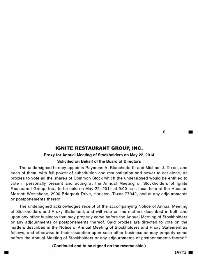 0 --------------- . . . . . . . . . . . . . . . . . . . . . . . . . . . . . . . . . . . . . . . . . . . . . . . . . . . . . . ---------------- 14475 IGNITE RESTAURANT GROUP, INC. Proxy for Annual Meeting of Stockholders on May 22, 2014 Solicited on Behalf of the Board of Directors The undersigned hereby appoints Raymond A. Blanchette III and Michael J. Dixon, and each of them, with full power of substitution and resubstitution and power to act alone, as proxies to vote all the shares of Common Stock which the undersigned would be entitled to vote if personally present and acting at the Annual Meeting of Stockholders of Ignite Restaurant Group, Inc., to be held on May 22, 2014 at 9:00 a.m. local time at the Houston Marriott Westchase, 2900 Briarpark Drive, Houston, Texas 77042, and at any adjournments or postponements thereof. The undersigned acknowledges receipt of the accompanying Notice of Annual Meeting of Stockholders and Proxy Statement, and will vote on the matters described in both and upon any other business that may properly come before the Annual Meeting of Stockholders or any adjournments or postponements thereof. Said proxies are directed to vote on the matters described in the Notice of Annual Meeting of Stockholders and Proxy Statement as follows, and otherwise in their discretion upon such other business as may properly come before the Annual Meeting of Stockholders or any adjournments or postponements thereof: (Continued and to be signed on the reverse side.) |