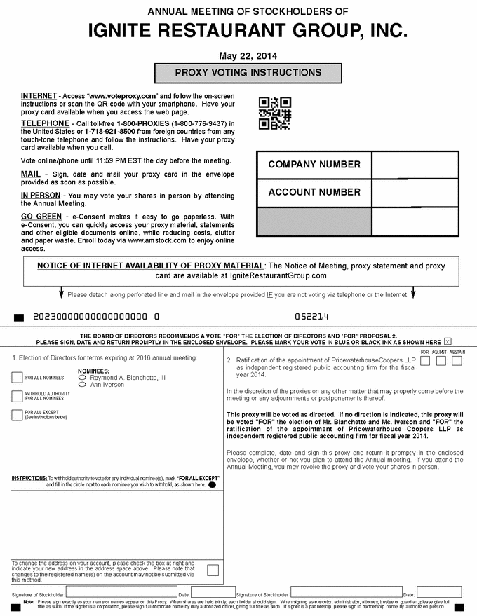 Signature of Stockholder Date: Signature of Stockholder Date: Note: Please sign exactly as your name or names appear on this Proxy. When shares are held jointly, each holder should sign. When signing as executor, administrator, attorney, trustee or guardian, please give full title as such. If the signer is a corporation, please sign full corporate name by duly authorized officer, giving full title as such. If signer is a partnership, please sign in partnership name by authorized person. To change the address on your account, please check the box at right and indicate your new address in the address space above. Please note that changes to the registered name(s) on the account may not be submitted via this method. 1. Election of Directors for terms expiring at 2016 annual meeting: O Raymond A. Blanchette, III O Ann Iverson 2. Ratification of the appointment of PricewaterhouseCoopers LLP as independent registered public accounting firm for the fiscal year 2014. In the discretion of the proxies on any other matter that may properly come before the meeting or any adjournments or postponements thereof. This proxy will be voted as directed. If no direction is indicated, this proxy will be voted "FOR" the election of Mr. Blanchette and Ms. Iverson and "FOR" the ratification of the appointment of Pricewaterhouse Coopers LLP as independent registered public accounting firm for fiscal year 2014. Please complete, date and sign this proxy and return it promptly in the enclosed envelope, whether or not you plan to attend the Annual meeting. If you attend the Annual Meeting, you may revoke the proxy and vote your shares in person. FOR AGAINST ABSTAIN FOR ALL NOMINEES WITHHOLD AUTHORITY FOR ALL NOMINEES FOR ALL EXCEPT (See instructions below) INSTRUCTIONS: To withhold authority to vote for any individual nominee(s), mark “FOR ALL EXCEPT” and fill in the circle next to each nominee you wish to withhold, as shown here: JOHN SMITH 1234 MAIN STREET APT. 203 NEW YORK, NY 10038 NOMINEES: ANNUAL MEETING OF STOCKHOLDERS OF IGNITE RESTAURANT GROUP, INC. May 22, 2014 INTERNET - Access “www.voteproxy.com” and follow the on-screen instructions or scan the QR code with your smartphone. Have your proxy card available when you access the web page. TELEPHONE - Call toll-free 1-800-PROXIES (1-800-776-9437) in the United States or 1-718-921-8500 from foreign countries from any touch-tone telephone and follow the instructions. Have your proxy card available when you call. Vote online/phone until 11:59 PM EST the day before the meeting. MAIL - Sign, date and mail your proxy card in the envelope provided as soon as possible. IN PERSON - You may vote your shares in person by attending the Annual Meeting. GO GREEN - e-Consent makes it easy to go paperless. With e-Consent, you can quickly access your proxy material, statements and other eligible documents online, while reducing costs, clutter and paper waste. Enroll today via www.amstock.com to enjoy online access. PROXY VOTING INSTRUCTIONS Please detach along perforated line and mail in the envelope provided IF you are not voting via telephone or the Internet. THE BOARD OF DIRECTORS RECOMMENDS A VOTE "FOR" THE ELECTION OF DIRECTORS AND "FOR" PROPOSAL 2. PLEASE SIGN, DATE AND RETURN PROMPTLY IN THE ENCLOSED ENVELOPE. PLEASE MARK YOUR VOTE IN BLUE OR BLACK INK AS SHOWN HERE x --------------- ---------------- 20230000000000000000 0 052214 COMPANY NUMBER ACCOUNT NUMBER NOTICE OF INTERNET AVAILABILITY OF PROXY MATERIAL: The Notice of Meeting, proxy statement and proxy card are available at IgniteRestaurantGroup.com |