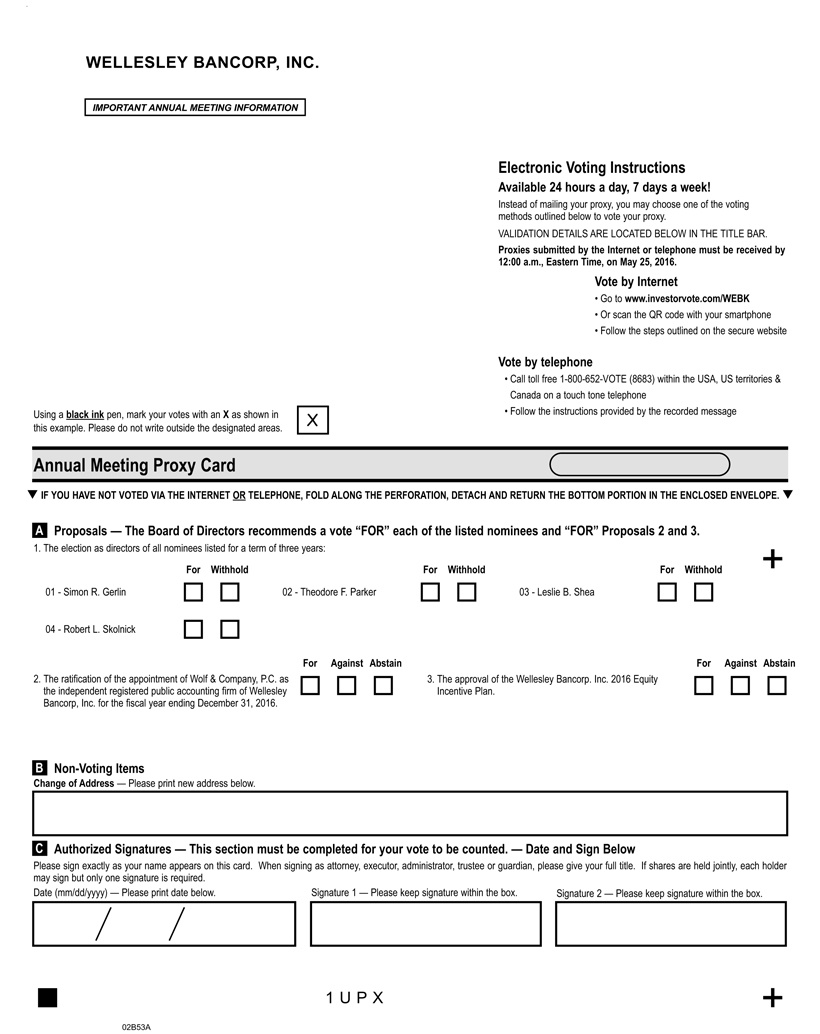 | (3) | The approval of the Wellesley Bancorp, Inc. 2016 Equity Incentive Plan; and | |