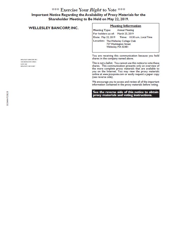 *** Exercise Your Right to Vote *** Important Notice Regarding the Availability of Proxy Materials for the Shareholder Meeting to Be Held on May 22, 2019. Meeting Information WELLESLEY BANCORP, INC. Meeting Type: Annual Meeting For holders as of: March 25, 2019 Date: May 22, 2019 Time: 10:30 a.m., Local Time Location: The Wellesley College Club 727 Washington Street Wellesley, MA 02481 You are receiving this communication because you hold shares in the company named above. This is not a ballot. You cannot use this notice to vote these shares. This communication presents only an overview of the more complete proxy materials that are available to you on the Internet. You may view the proxy materials online at www.proxyvote.com or easily request a paper copy (see reverse side). We encourage you to access and review all of the important information contained in the proxy materials before voting. WELLESLEY BANCORP, INC. 100 WORCESTER STREET, SUITE 300 WELLESLEY, MA 02481 E63444-P20628 See the reverse side of this notice to obtain proxy materials and voting instructions.
