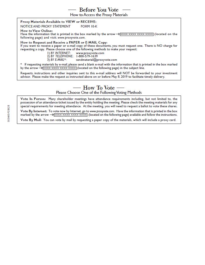 Before You Vote How to Access the Proxy Materials Proxy Materials Available to VIEW or RECEIVE: NOTICE AND PROXY STATEMENT FORM 10-K How to View Online: Have the information that is printed in the box marked by the arrow (located on the following page) and visit: www.proxyvote.com. How to Request and Receive a PAPER or E-MAIL Copy: If you want to receive a paper or e-mail copy of these documents, you must request one. There is NO charge for requesting a copy. Please choose one of the following methods to make your request: 1) BY INTERNET: www.proxyvote.com 2) BY TELEPHONE: 1-800-579-1639 3) BY E-MAIL*: sendmaterial@proxyvote.com * If requesting materials by e-mail, please send a blank e-mail with the information that is printed in the box marked by the arrow (located on the following page) in the subject line. . XXXX XXXX XXXX XXXX . XXXX XXXX XXXX XXXX Requests, instructions and other inquiries sent to this e-mail address will NOT be forwarded to your investment advisor. Please make the request as instructed above on or before May 8, 2019 to facilitate timely delivery. How To Vote E63445-P20628 Please Choose One of the Following Voting Methods Vote In Person: Many shareholder meetings have attendance requirements including, but not limited to, the possession of an attendance ticket issued by the entity holding the meeting. Please check the meeting materials for any special requirements for meeting attendance. At the meeting, you will need to request a ballot to vote these shares. Vote By Internet: To vote now by Internet, go to www.proxyvote.com. Have the information that is printed in the box marked by the arrow (located on the following page) available and follow the instructions. Vote By Mail: You can vote by mail by requesting a paper copy of the materials, which will include a proxy card.