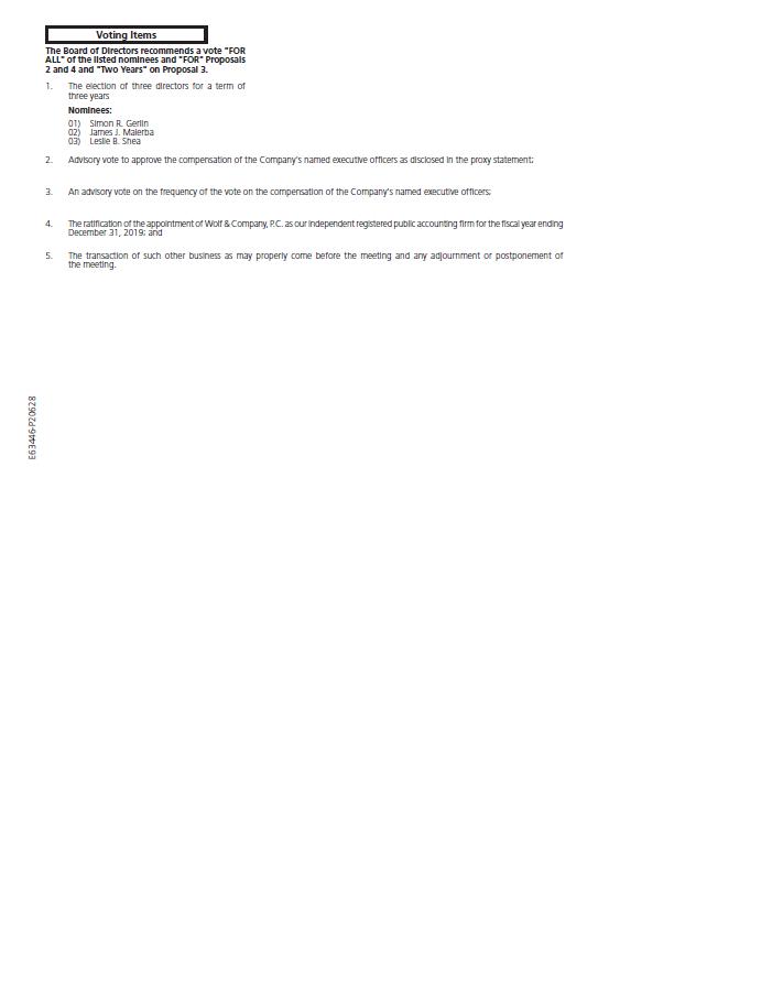 Voting Items The Board of Directors recommends a vote "FOR ALL" of the listed nominees and "FOR" Proposals 2 and 4 and "Two Years" on Proposal 3. 1. The election of three directors for a term of three years Nominees: 01) Simon R. Gerlin 02) James J. Malerba 03) Leslie B. Shea 2. Advisory vote to approve the compensation of the Company's named executive officers as disclosed in the proxy statement; 3. An advisory vote on the frequency of the vote on the compensation of the Company's named executive officers; 4. The ratification of the appointment of Wolf & Company, P.C. as our independent registered public accounting firm for the fiscal year ending December 31, 2019; and 5. The transaction of such other business as may properly come before the meeting and any adjournment or postponement of the meeting. E63446-P20628