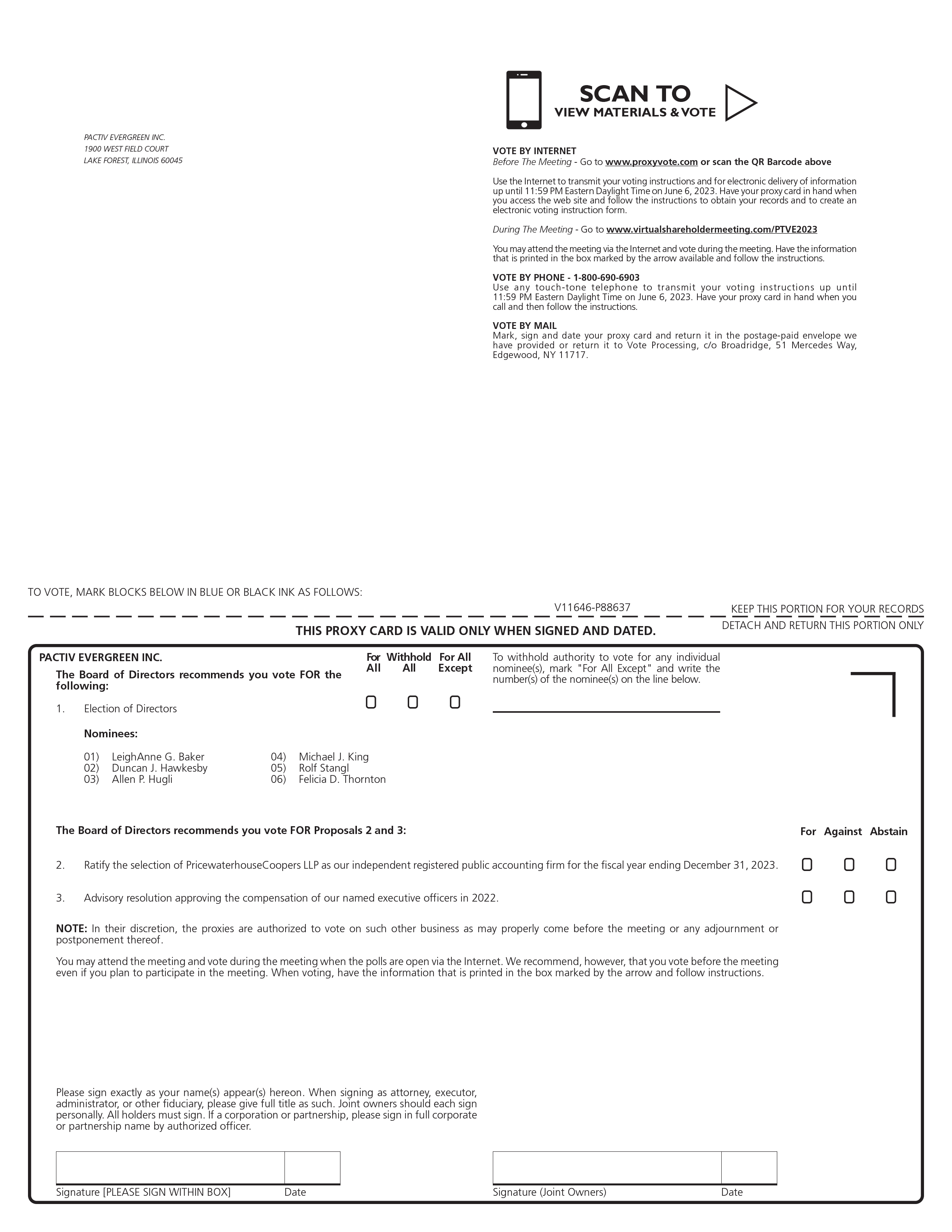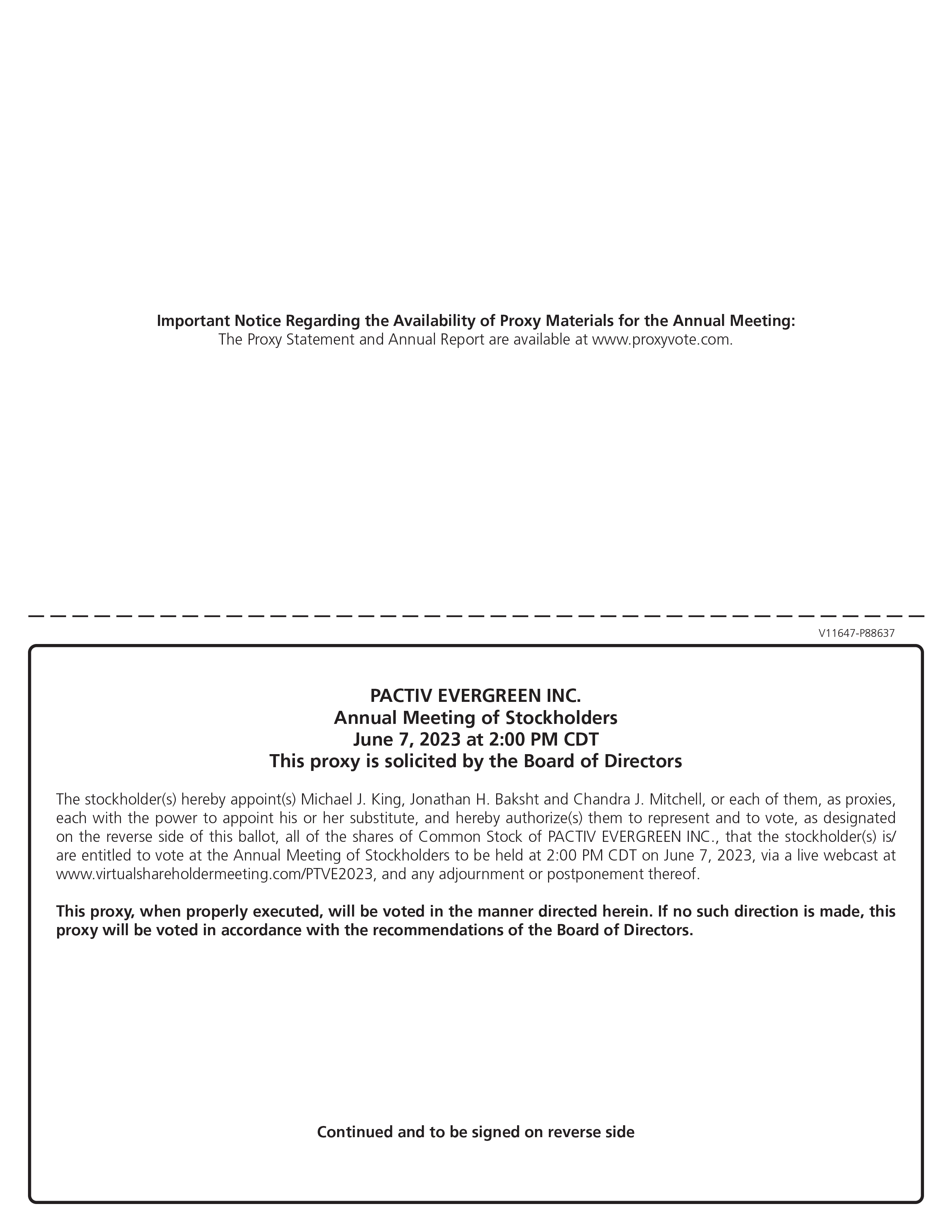 The Notice contains instructions on how to access our proxy materials and vote over the Internet at www.proxyvote.com and how shareholders can receive a paper copy of our proxy materials, including the accompanying Proxy Statement, a Proxy Card or voting instruction card and our Annual Report on Form 10-K. Shareholders can also request to receive future proxy materials in printed form by contacting our Corporate Secretary by mail at Pactiv Evergreen Inc., 1900 West Field Court, Lake Forest, Illinois 60045, Attention: Corporate Secretary, or electronically by email at corpsec@pactivevergreen.com.
