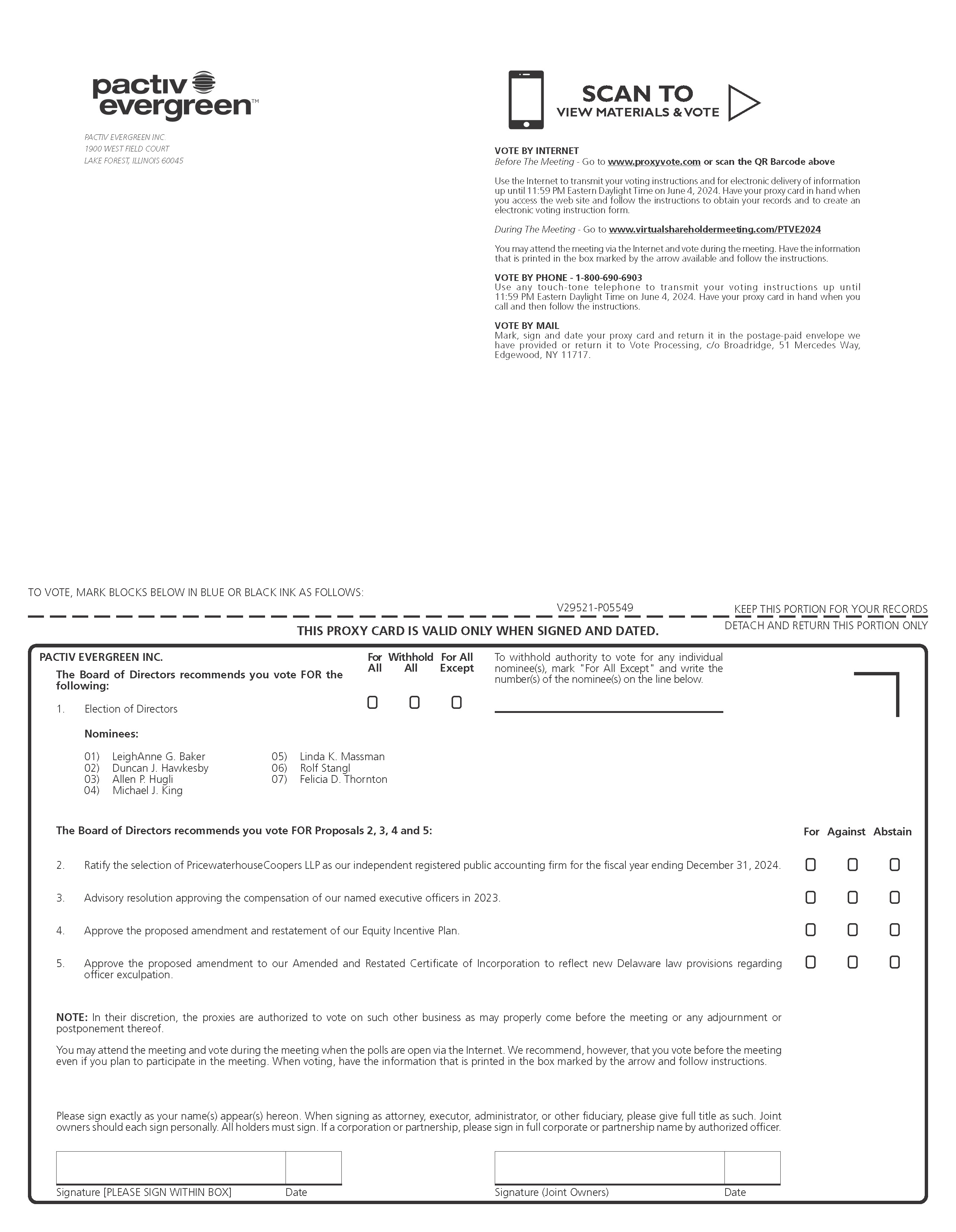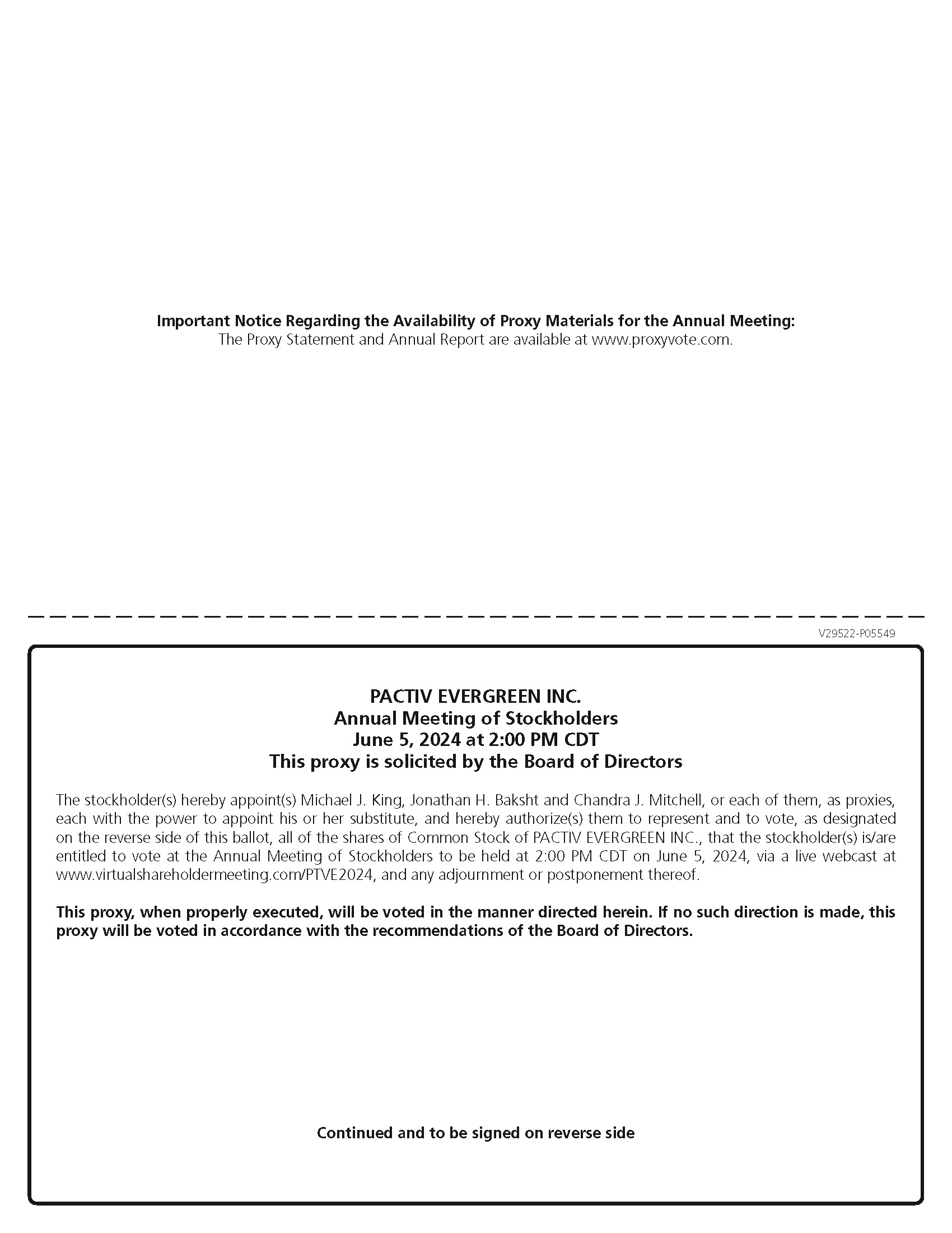You are cordially invited to attend the 2024 Annual Meeting of Shareholders, which we refer to as the Annual Meeting, of Pactiv Evergreen Inc., to be held in virtual meeting format only at 2:00 p.m. Central Daylight Time, Wednesday, June 5, 2024, for the following purposes:
