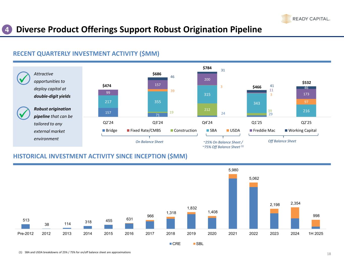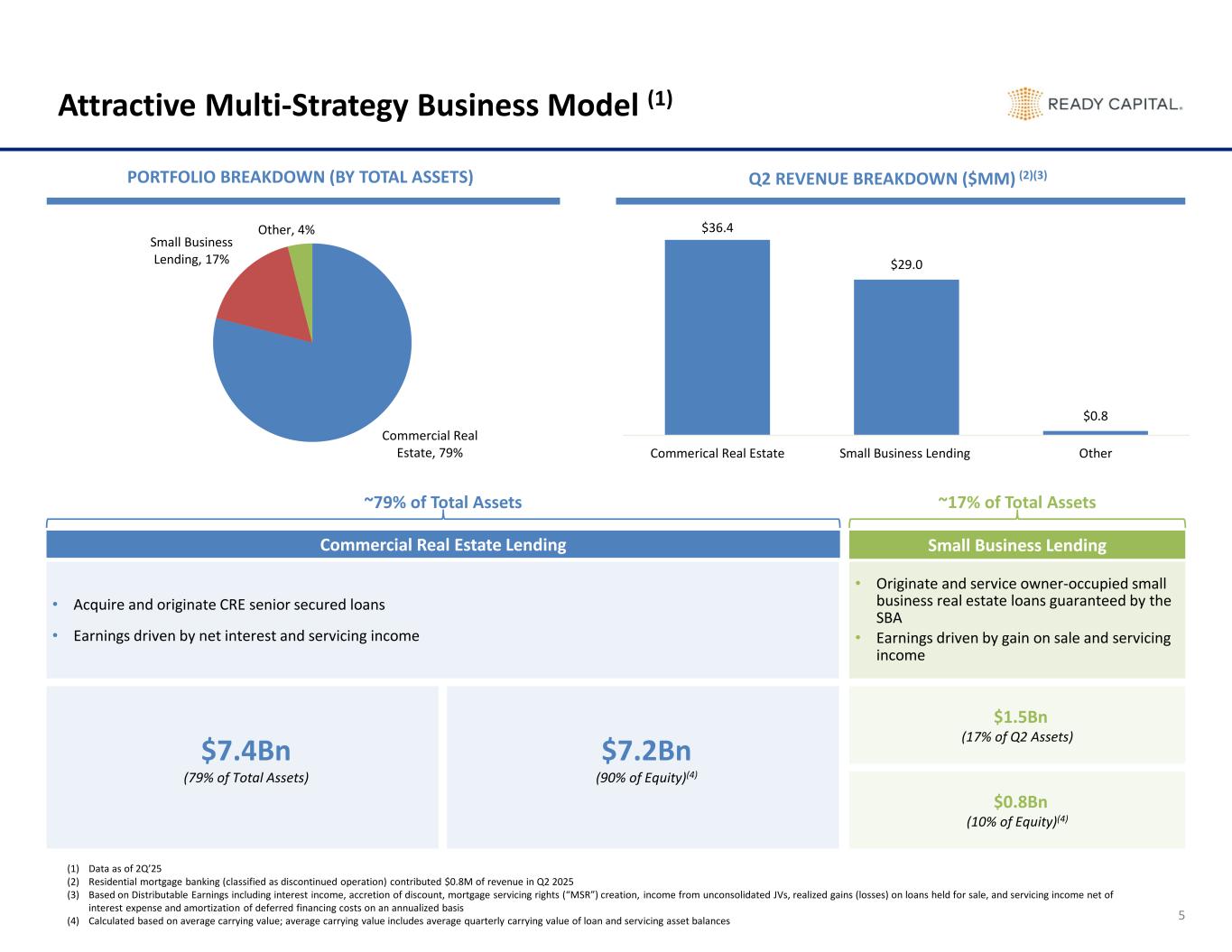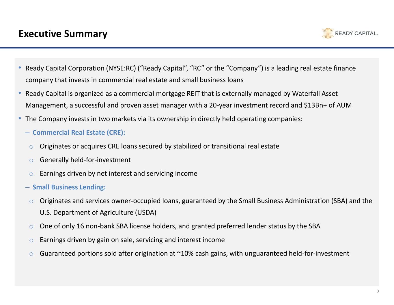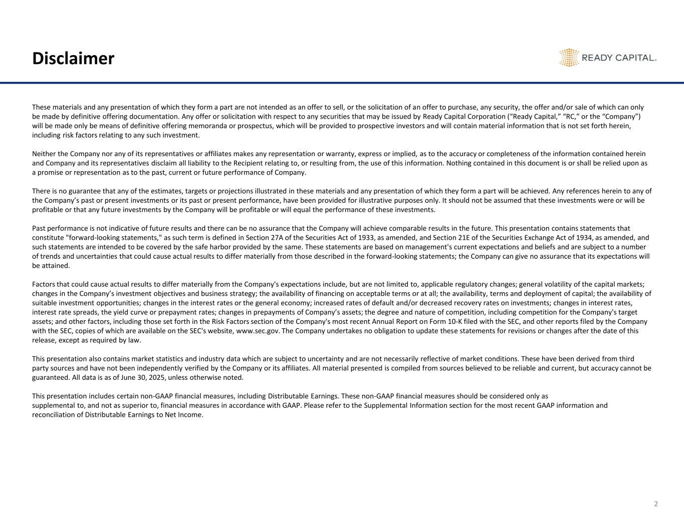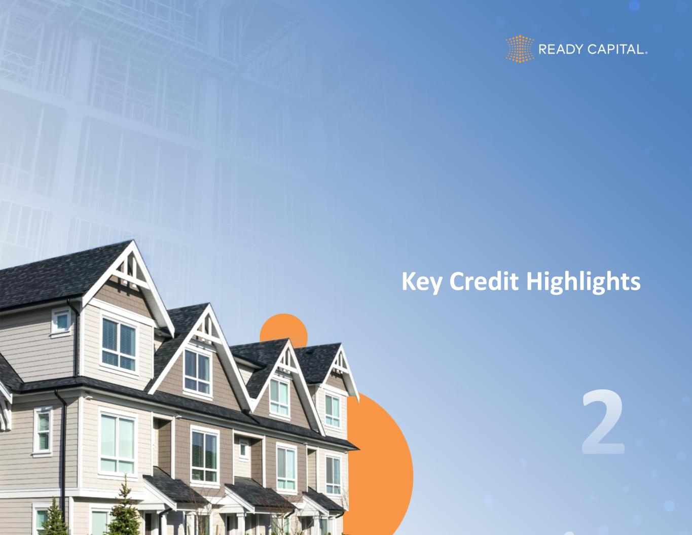 2 Disclaimer These materials and any presentation of which they form a part are not intended as an offer to sell, or the solicitation of an offer to purchase, any security, the offer and/or sale of which can only be made by definitive offering documentation. Any offer or solicitation with respect to any securities that may be issued by Ready Capital Corporation (“Ready Capital,” “RC,” or the “Company”) will be made only be means of definitive offering memoranda or prospectus, which will be provided to prospective investors and will contain material information that is not set forth herein, including risk factors relating to any such investment. Neither the Company nor any of its representatives or affiliates makes any representation or warranty, express or implied, as to the accuracy or completeness of the information contained herein and Company and its representatives disclaim all liability to the Recipient relating to, or resulting from, the use of this information. Nothing contained in this document is or shall be relied upon as a promise or representation as to the past, current or future performance of Company. There is no guarantee that any of the estimates, targets or projections illustrated in these materials and any presentation of which they form a part will be achieved. Any references herein to any of the Company’s past or present investments or its past or present performance, have been provided for illustrative purposes only. It should not be assumed that these investments were or will be profitable or that any future investments by the Company will be profitable or will equal the performance of these investments. Past performance is not indicative of future results and there can be no assurance that the Company will achieve comparable results in the future. This presentation contains statements that constitute "forward-looking statements," as such term is defined in Section 27A of the Securities Act of 1933, as amended, and Section 21E of the Securities Exchange Act of 1934, as amended, and such statements are intended to be covered by the safe harbor provided by the same. These statements are based on management's current expectations and beliefs and are subject to a number of trends and uncertainties that could cause actual results to differ materially from those described in the forward-looking statements; the Company can give no assurance that its expectations will be attained. Factors that could cause actual results to differ materially from the Company's expectations include, but are not limited to, applicable regulatory changes; general volatility of the capital markets; changes in the Company’s investment objectives and business strategy; the availability of financing on acceptable terms or at all; the availability, terms and deployment of capital; the availability of suitable investment opportunities; changes in the interest rates or the general economy; increased rates of default and/or decreased recovery rates on investments; changes in interest rates, interest rate spreads, the yield curve or prepayment rates; changes in prepayments of Company’s assets; the degree and nature of competition, including competition for the Company's target assets; and other factors, including those set forth in the Risk Factors section of the Company's most recent Annual Report on Form 10-K filed with the SEC, and other reports filed by the Company with the SEC, copies of which are available on the SEC's website, www.sec.gov. The Company undertakes no obligation to update these statements for revisions or changes after the date of this release, except as required by law. This presentation also contains market statistics and industry data which are subject to uncertainty and are not necessarily reflective of market conditions. These have been derived from third party sources and have not been independently verified by the Company or its affiliates. All material presented is compiled from sources believed to be reliable and current, but accuracy cannot be guaranteed. All data is as of June 30, 2025, unless otherwise noted. This presentation includes certain non-GAAP financial measures, including Distributable Earnings. These non-GAAP financial measures should be considered only as supplemental to, and not as superior to, financial measures in accordance with GAAP. Please refer to the Supplemental Information section for the most recent GAAP information and reconciliation of Distributable Earnings to Net Income.