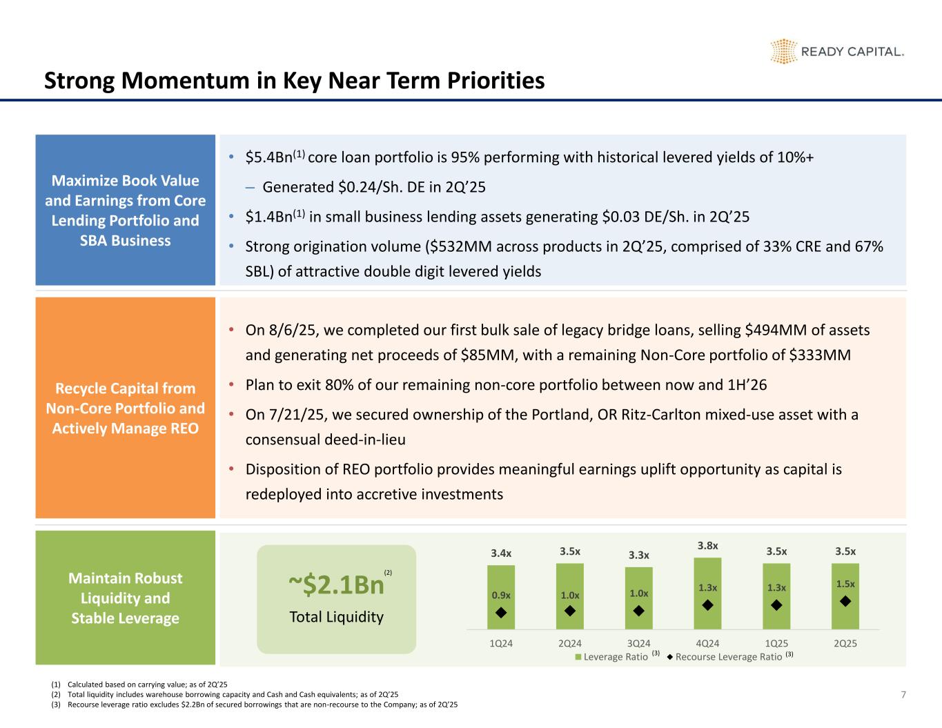 $536 $545 $825 $815 $1,276 $1,791 $2,540 $1,838 $1,827 2017 2018 2019 2020 2021 2022 2023 2024 2025 2.8x 3.8x 4.2x 4.6x 5.9x 5.1x 3.3x 3.8x 3.5x 2017 2018 2019 2020 2021 2022 2023 2024 2025 $2,524 $3,037 $4,977 $5,372 $9,534 $11,621 $12,441 $10,142 $9,309 2017 2018 2019 2020 2021 2022 2023 2024 2025 $2,019 $2,520 $4,150 $4,252 $8,308 $10,372 $10,894 $9,032 $8,542 2017 2018 2019 2020 2021 2022 2023 2024 2025 21 Meaningful Balance Sheet Growth Over a Long History(1) LEVERAGE RATIO (DEBT-EQUITY)(3) TOTAL STOCKHOLDERS' EQUITY ($MM)(3) LOANS ($MM)(2) TOTAL ASSETS ($MM) • Ready Capital has grown its balance sheet substantially over its history, with its total assets grown at a 18% CAGR from 2017 to June 30, 2025 • Debt is comprised of a well diversified mix of corporate borrowings and securitizations • Ready Capital’s equity has grown over 3x since 2017 • Recent focus on strengthening the portfolio and balance sheet through select asset sales, proactive asset management and opportunistic share repurchases has resulted in a better but moderately smaller business, building the foundation for the next stage of growth (1) Data as of 2Q’25 (2) Based on UPB (3) Includes total stockholders' equity attributable to Ready Capital shareholders, excluding non-controlling interest 6