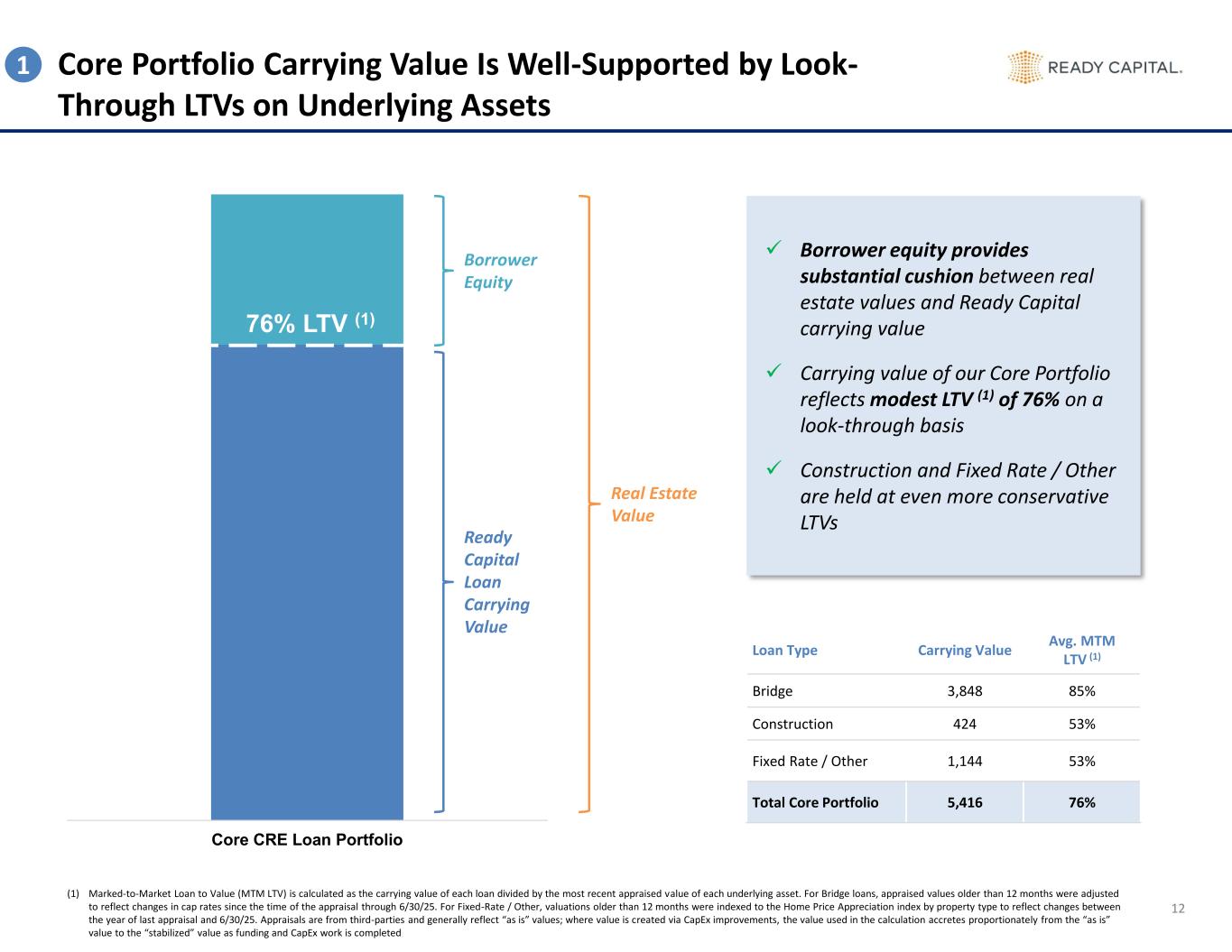 Core CRE Loan Portfolio 76% LTV (1) Core Portfolio Carrying Value Is Well-Supported by Look- Through LTVs on Underlying Assets 12 ✓ Borrower equity provides substantial cushion between real estate values and Ready Capital carrying value ✓ Carrying value of our Core Portfolio reflects modest LTV (1) of 76% on a look-through basis ✓ Construction and Fixed Rate / Other are held at even more conservative LTVs Loan Type Carrying Value Avg. MTM LTV (1) Bridge 3,848 85% Construction 424 53% Fixed Rate / Other 1,144 53% Total Core Portfolio 5,416 76% Borrower Equity Ready Capital Loan Carrying Value Real Estate Value (1) Marked-to-Market Loan to Value (MTM LTV) is calculated as the carrying value of each loan divided by the most recent appraised value of each underlying asset. For Bridge loans, appraised values older than 12 months were adjusted to reflect changes in cap rates since the time of the appraisal through 6/30/25. For Fixed-Rate / Other, valuations older than 12 months were indexed to the Home Price Appreciation index by property type to reflect changes between the year of last appraisal and 6/30/25. Appraisals are from third-parties and generally reflect “as is” values; where value is created via CapEx improvements, the value used in the calculation accretes proportionately from the “as is” value to the “stabilized” value as funding and CapEx work is completed 1