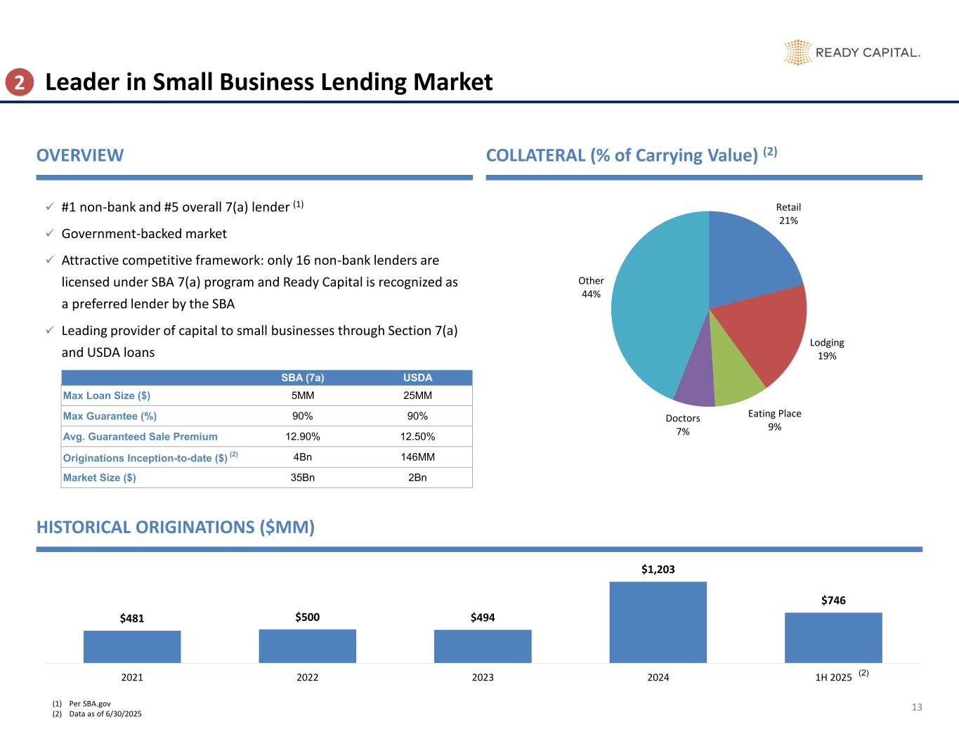 SBA (7a) USDA Max Loan Size ($) 5MM 25MM Max Guarantee (%) 90% 90% Avg. Guaranteed Sale Premium 12.90% 12.50% Originations Inception-to-date ($) (2) 4Bn 146MM Market Size ($) 35Bn 2Bn $481 $500 $494 $1,203 $746 2021 2022 2023 2024 1H 2025 (2) Retail 21% Lodging 19% Eating Place 9% Doctors 7% Other 44% 13 Leader in Small Business Lending Market HISTORICAL ORIGINATIONS ($MM) ✓ #1 non-bank and #5 overall 7(a) lender (1) ✓ Government-backed market ✓ Attractive competitive framework: only 16 non-bank lenders are licensed under SBA 7(a) program and Ready Capital is recognized as a preferred lender by the SBA ✓ Leading provider of capital to small businesses through Section 7(a) and USDA loans OVERVIEW COLLATERAL (% of Carrying Value) (2) 2 (1) Per SBA.gov (2) Data as of 6/30/2025