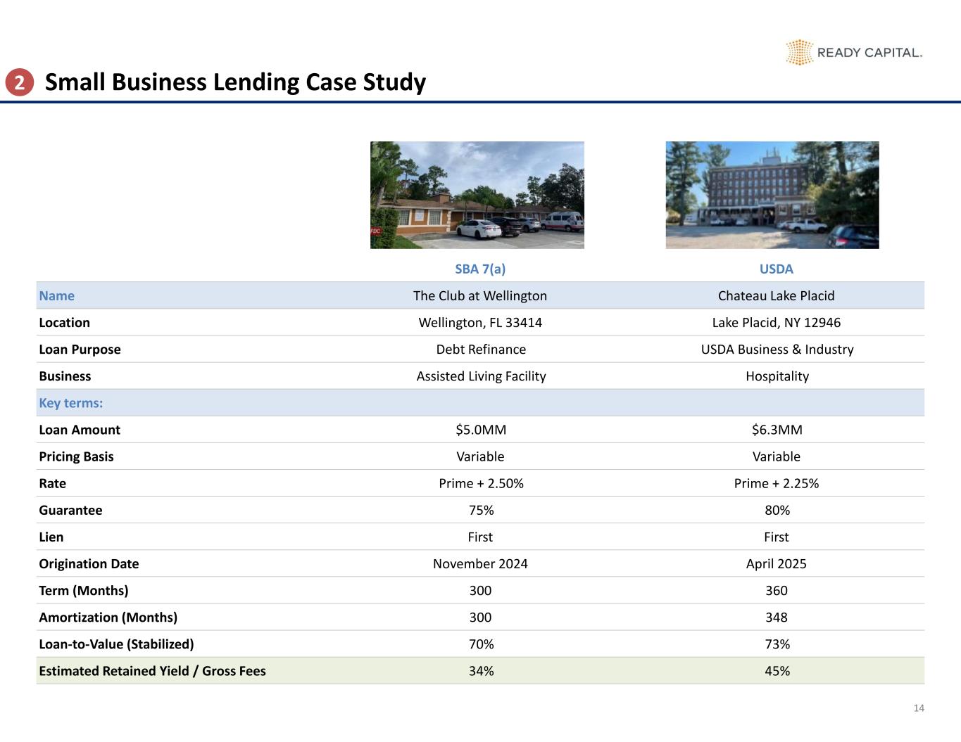 14 Small Business Lending Case Study SBA 7(a) USDA Name The Club at Wellington Chateau Lake Placid Location Wellington, FL 33414 Lake Placid, NY 12946 Loan Purpose Debt Refinance USDA Business & Industry Business Assisted Living Facility Hospitality Key terms: Loan Amount $5.0MM $6.3MM Pricing Basis Variable Variable Rate Prime + 2.50% Prime + 2.25% Guarantee 75% 80% Lien First First Origination Date November 2024 April 2025 Term (Months) 300 360 Amortization (Months) 300 348 Loan-to-Value (Stabilized) 70% 73% Estimated Retained Yield / Gross Fees 34% 45% 2