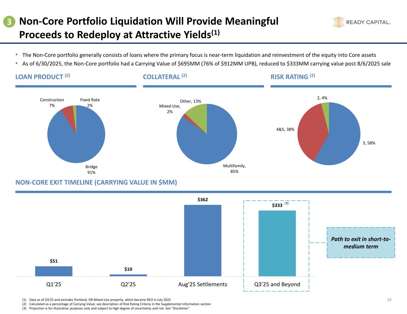 Debt Yield Range # of Loans Carrying Value UPB Equity LTV (11) >=9% 16 293 293 66 59% 8% - 9% 9 214 214 47 65% 7% - 8% 8 115 115 24 67% 6% - 7% 13 233 234 56 66% 5% - 6% 12 328 330 98 73% 4% - 5% 7 353 354 110 77% 3% - 4% 1 63 64 24 92% 2% - 3% 3 196 199 70 85% 1% - 2% 1 35 35 16 60% NOI Generating Assets 70 1,831 1,837 511 70% Non-NOI Generating Assets 19 226 249 80 46% Total 89 2,057 2,086 592 66% Property Type # of Loans Carrying Value UPB Equity % Current Pay(6) Wtd. Avg. Fully Ext. Maturity (7) Multifamily 63 1,709 1,716 487 92% Mar-27 Office 6 81 81 30 100% Jan-26 Industrial 6 84 85 17 100% Oct-28 Hospitality 3 65 65 21 100% Nov-26 Land 7 56 77 21 100% Dec-27 Mobile Home Park 2 36 36 11 100% Oct-30 Mixed-Use 2 26 26 4 100% Aug-26 Select Loans Subtotal 89 2,057 2,086 592 94% Apr-27 Cash (2) 58 REO 432 526 274 Investments in Unconsolidated JVs (3) 157 Other Loans and Net Liabilities (4) 383 576 131 Preferred Equity 33 40 33 Accrued Interest (5) 44 Total (1) 1,288 Overview of RC Holdings, LLC KEY HIGHLIGHTS SUMMARY OF RC HOLDINGS, LLC ASSETS OVERVIEW OF SELECT LOANS (8) • Total combined equity value of $1,288MM(1) including Select Loans with UPB of $2,086MM and equity value of $592MM, as well as cash of $58MM • Select Loans represent ~46% of the equity value and are comprised of 100% Core loans that are risk-rated 3 or better • Includes REO asset with carrying value of $432MM and equity value of $274MM • Multifamily loans represent the largest portion with UPB of $1,716MM and equity value of $487MM By Property Type Multifamily 82% Office 5% Land 4% Hospitality 4% Other 5% Select Loans 46% REO 21% Investments in Unconsolidated JVs 12% Other Loans and Net Liabilities 10% Cash 5% Accrued Interest 3% Preferred Equity 3% $MM, unless otherwise noted OVERVIEW OF RC HOLDINGS, LLC ASSETS(8) By Asset Type 24 By Risk Rating (9) RR 1 9% RR 2 49% RR 3 42% (4) (3) (5) (2) (1) Excludes $99MM of corporate debt (2) Includes Cash, Cash Equivalents, and Restricted Cash (3) Primarily related to Ready Capital’s share of investments sourced by Waterfall with underwritten yields of 8.6% - 15.9%; includes a mix of acquired loans, CMBS investments, and equity across a wide range of property types (4) Includes 47 loans that are primarily non-Core and/or risk-rated 4 or 5, as well as $3MM of other net liabilities (5) Reflects $29.6MM related to loans, with the remaining $13.9MM related to preferred equity investment (6) Represents the percentage of Carrying Value that relates to loans that are Current Pay (7) Weighted average of fully extended maturities, calculated using equity value as the weighting factor (8) Pie charts based on equity value (9) See description of Risk Rating Criteria in the Supplemental Information section (10) Primarily comprised of current pay construction loans; see page 27 for further breakdown (11) LTV is calculated by dividing the carrying value by the appraisal value (10) By Debt Yield
