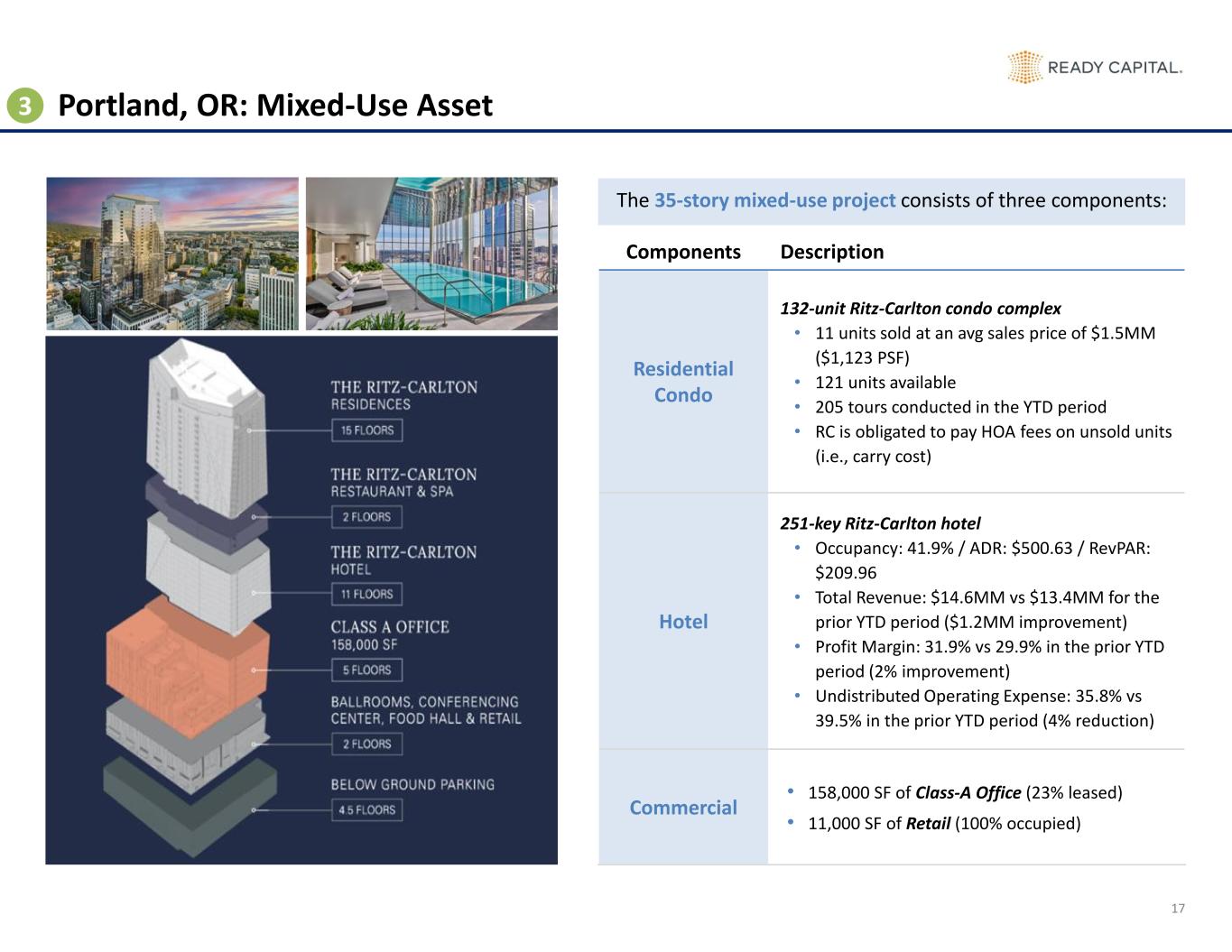 $42 $118 $255 $195 $218 $216 2021 2022 2023 2024 1Q'25 2Q'25 Land, 39% Multifamily, 31% Mixed-Use, 18% Lodging, 6% Office, 6% Texas, 35% California, 17%Colorado, 12% Oregon, 11% Other, 25% 16 Manageable Real Estate Owned Exposure (1) REO DETAILS REO CARRYING VALUE (in $MM) # OF ASSETS CARRYING VALUE OPERATE TO SELL 4 $36MM SELL 16 $105MM UNDER CONTRACT 8 $75MM TOTAL 28 $216MM Collateral (2) Geography (2) 0.4% 1.0% 2.0% 1.9% 2.2% % of Total Assets $216MM of REO exposure across the portfolio as of 2Q’25 (prior to taking ownership of Portland, OR Ritz-Carlton Mixed-Use asset; $432MM carrying value), providing additional opportunity to harvest capital to recycle into more attractive investments 3 2.3% (1) Data as of 2Q’25 and excludes Portland, OR Mixed-Use property, which became REO in July 2025 and has Carrying Value of $432MM (2) Calculated as a percentage of Carrying Value