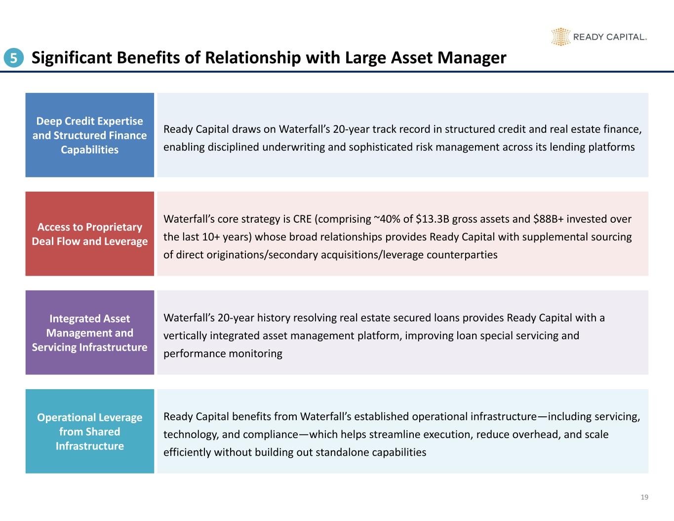 513 38 114 318 455 631 966 1,318 1,832 1,408 5,980 5,062 2,198 2,354 998 Pre-2012 2012 2013 2014 2015 2016 2017 2018 2019 2020 2021 2022 2023 2024 1H 2025 CRE SBL 18 Diverse Product Offerings Support Robust Origination Pipeline RECENT QUARTERLY INVESTMENT ACTIVITY ($MM) 4 157 71 24 2919 212 39 217 355 315 343 216 39 3 3 97 99 157 200 11 173 46 31 41 46 Q2'24 Q3'24 Q4'24 Q1'25 Q2'25 Bridge Fixed Rate/CMBS Construction SBA USDA Freddie Mac Working Capital $474 $686 $784 $466 $532 (1) SBA and USDA breakdowns of 25% / 75% for on/off balance sheet are approximations ✓ ✓ Attractive opportunities to deploy capital at double-digit yields Robust origination pipeline that can be tailored to any external market environment On Balance Sheet Off Balance Sheet~25% On Balance Sheet / ~75% Off Balance Sheet (1) HISTORICAL INVESTMENT ACTIVITY SINCE INCEPTION ($MM)