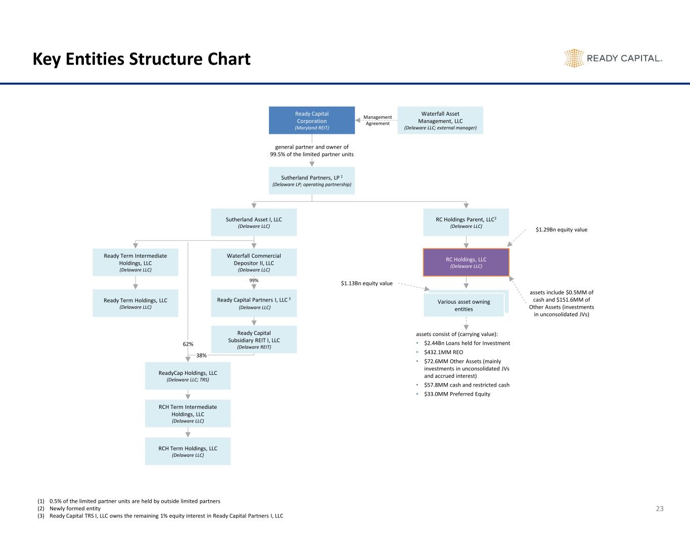 Key Entities Structure Chart 23 Management Agreement Waterfall Asset Management, LLC (Delaware LLC; external manager) Ready Capital Subsidiary REIT I, LLC (Delaware REIT) ReadyCap Holdings, LLC (Delaware LLC; TRS) RCH Term Intermediate Holdings, LLC (Delaware LLC) RCH Term Holdings, LLC (Delaware LLC) Sutherland Asset I, LLC (Delaware LLC) RC Holdings Parent, LLC2 (Delaware LLC) Ready Capital Corporation (Maryland REIT) Sutherland Partners, LP 1 (Delaware LP; operating partnership) general partner and owner of 99.5% of the limited partner units Waterfall Commercial Depositor II, LLC (Delaware LLC) Ready Term Intermediate Holdings, LLC (Delaware LLC) RC Holdings, LLC (Delaware LLC) Ready Capital Partners I, LLC 3 (Delaware LLC) Ready Term Holdings, LLC (Delaware LLC) Various asset owning entities assets include $0.5MM of cash and $151.6MM of Other Assets (investments in unconsolidated JVs) assets consist of (carrying value): • $2.44Bn Loans held for Investment • $432.1MM REO • $72.6MM Other Assets (mainly investments in unconsolidated JVs and accrued interest) • $57.8MM cash and restricted cash • $33.0MM Preferred Equity 99% 62% 38% $1.29Bn equity value $1.13Bn equity value (1) 0.5% of the limited partner units are held by outside limited partners (2) Newly formed entity (3) Ready Capital TRS I, LLC owns the remaining 1% equity interest in Ready Capital Partners I, LLC