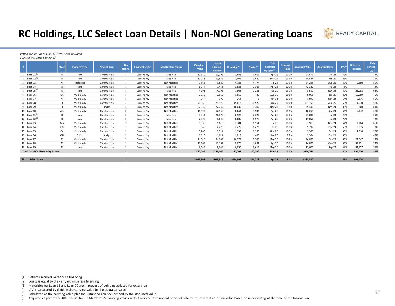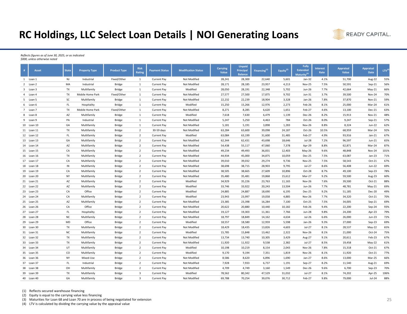 # Asset State Property Type Product Type Risk Rating Payment Status Modification Status Carrying Value Unpaid Principal Balance Financing(1) Equity(2) Fully Extended Maturity(3) Interest Rate Appraisal Value Appraisal Date LTV(4) 41 Loan 41 AZ Multifamily Bridge 3 30-59 days Not Modified 63,583 64,000 43,236 20,347 Apr-27 7.8% 67,900 Jul-24 94% 42 Loan 42 TX Multifamily Bridge 3 Current Pay Modified 59,840 59,979 34,500 25,340 Jan-27 8.0% 87,771 Jan-23 68% 43 Loan 43 TX Multifamily Bridge 3 Current Pay Modified 56,324 56,375 47,919 8,406 Mar-26 7.9% 76,676 Jan-23 73% 44 Loan 44 IL Multifamily Bridge 3 Current Pay Modified 53,966 53,998 45,898 8,068 Apr-27 7.8% 86,161 Mar-22 63% 45 Loan 45 FL Multifamily Bridge 3 Current Pay Not Modified 50,051 50,090 35,446 14,605 Jun-27 7.6% 69,579 Apr-22 72% 46 Loan 46 AZ Multifamily Bridge 3 Current Pay Not Modified 49,436 49,442 37,082 12,354 Dec-26 7.7% 86,965 Feb-23 57% 47 Loan 47 MO Multifamily Bridge 3 Current Pay Modified 38,481 38,518 32,740 5,741 Jan-26 7.5% 57,525 Nov-24 67% 48 Loan 48 TX Multifamily Bridge 3 Current Pay Modified 33,435 33,455 25,091 8,343 Dec-26 7.7% 48,078 Nov-21 70% 49 Loan 49 GA Hospitality Fixed/Other 3 Current Pay Modified 30,334 30,366 19,565 10,769 Dec-25 9.1% 51,350 Nov-22 59% 50 Loan 50 NV Multifamily Bridge 3 Current Pay Modified 26,752 26,763 22,748 4,003 Nov-26 7.7% 44,323 Oct-21 60% 51 Loan 51 KY Multifamily Bridge 3 Current Pay Not Modified 21,620 21,632 16,224 5,396 Jun-27 8.0% 32,295 May-22 67% 52 Loan 52 AZ Multifamily Bridge 3 Current Pay Not Modified 21,367 21,375 18,169 3,199 Mar-27 8.7% 32,669 Feb-22 65% 53 Loan 53 AZ Multifamily Bridge 3 Current Pay Not Modified 20,859 20,870 14,263 6,596 Jun-27 8.0% 30,364 May-22 69% 54 Loan 54 NV Multifamily Bridge 3 Current Pay Not Modified 18,854 18,862 13,203 5,651 Mar-27 8.9% 28,391 Jan-22 66% 55 Loan 55 KY Multifamily Bridge 3 Current Pay Modified 17,949 17,959 15,258 2,692 Apr-27 8.1% 26,857 Mar-22 67% 56 Loan 56 CA Mixed-Use Bridge 3 Current Pay Modified 17,789 17,791 15,057 2,732 Jun-26 9.1% 39,525 Apr-21 45% 57 Loan 57 SC Multifamily Bridge 3 Current Pay Not Modified 13,134 13,135 11,165 1,969 Jun-27 8.3% 23,848 May-22 55% 58 Loan 58 TX Multifamily Bridge 3 Current Pay Modified 12,156 12,188 9,711 2,445 Dec-26 8.1% 23,428 Oct-21 52% 59 Loan 59 TX Multifamily Bridge 3 Current Pay Not Modified 12,047 12,078 9,663 2,385 Jun-27 8.1% 14,400 May-25 84% 60 Loan 60 CA Multifamily Bridge 3 Current Pay Modified 11,699 11,725 8,794 2,905 Jul-27 8.5% 21,359 Jun-22 55% 61 Loan 61 TX Multifamily Bridge 3 Current Pay Modified 10,759 10,766 9,151 1,608 Jun-26 7.7% 15,457 May-21 70% 62 Loan 62 WA Office Bridge 3 Current Pay Modified 8,819 8,862 5,593 3,227 Jan-27 8.9% 15,010 Jan-23 59% 63 Loan 63 TX Multifamily Bridge 3 Current Pay Modified 8,255 8,258 7,019 1,236 May-26 8.0% 12,888 Apr-21 64% 64 Loan 64 NJ Multifamily Bridge 3 Current Pay Not Modified 7,487 7,489 6,365 1,122 Feb-27 8.4% 12,308 Jan-21 61% 65 Loan 65 WA Multifamily Bridge 3 Current Pay Not Modified 7,339 7,340 5,138 2,201 Mar-27 8.4% 11,955 Jan-22 61% 66 Loan 66 OK Multifamily Bridge 3 30-59 days Not Modified 6,194 6,220 4,199 1,995 Jan-27 7.8% 7,015 Jan-25 88% 67 Loan 67 TX Multifamily Bridge 3 Current Pay Modified 6,104 6,105 5,125 979 Jun-26 8.5% 10,100 Apr-24 60% 68 Loan 68 OR Office Bridge 3 Current Pay Modified 6,000 6,290 2,033 3,967 Apr-25 7.8% 9,500 Oct-22 63% 69 Loan 69 CT Industrial Bridge 3 Current Pay Not Modified 5,097 5,100 4,335 762 Mar-27 8.3% 7,375 Jan-23 69% 70 Loan 70 TX Multifamily Bridge 3 Current Pay Modified 3,166 3,167 2,452 714 Aug-25 8.8% 5,538 Jan-23 57% Total NOI Generating Assets 2 1,830,545 1,837,268 1,319,113 511,432 Feb-27 8.0% 2,616,826 70% RC Holdings, LLC Select Loan Details | NOI Generating Loans 26 Reflects figures as of June 30, 2025, or as indicated $000, unless otherwise noted (1) Reflects secured warehouse financing (2) Equity is equal to the carrying value less financing (3) Maturities for Loan 68 and Loan 70 are in process of being negotiated for extension (4) LTV is calculated by dividing the carrying value by the appraisal value