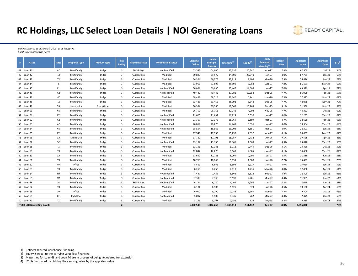 # Asset State Property Type Product Type Risk Rating Payment Status Modification Status Carrying Value Unpaid Principal Balance Financing(1) Equity(2) Fully Extended Maturity(3) Interest Rate Appraisal Value Appraisal Date LTV(4) 1 Loan 1 NJ Industrial Fixed/Other 1 Current Pay Not Modified 28,241 28,300 22,640 5,601 Jan-32 4.1% 51,700 Aug-22 55% 2 Loan 2 MA Industrial Bridge 1 Current Pay Not Modified 28,171 28,185 23,957 4,213 Nov-25 7.5% 50,591 Sep-21 56% 3 Loan 3 TX Multifamily Bridge 1 Current Pay Modified 28,050 28,191 22,348 5,702 Jun-26 7.7% 42,664 May-21 66% 4 Loan 4 TX Mobile Home Park Fixed/Other 1 Current Pay Not Modified 27,577 27,500 17,875 9,702 Jun-31 3.7% 39,500 Nov-24 70% 5 Loan 5 SC Multifamily Bridge 1 Current Pay Not Modified 22,232 22,239 18,904 3,328 Jan-26 7.8% 37,870 Nov-21 59% 6 Loan 6 FL Hospitality Bridge 1 Current Pay Modified 15,250 15,266 12,976 2,273 Feb-26 8.1% 25,000 Mar-24 61% 7 Loan 7 TX Mobile Home Park Fixed/Other 1 Current Pay Not Modified 8,271 8,285 6,620 1,651 Feb-27 4.6% 13,100 Dec-21 63% 8 Loan 8 AZ Multifamily Bridge 1 Current Pay Modified 7,618 7,630 6,479 1,139 Dec-26 8.2% 15,913 Nov-21 48% 9 Loan 9 PA Industrial Bridge 1 Current Pay Not Modified 5,247 5,250 4,463 784 Oct-26 8.0% 9,247 Sep-21 57% 10 Loan 10 GA Multifamily Bridge 1 Current Pay Not Modified 5,181 5,191 3,898 1,283 Nov-26 8.8% 8,324 Jun-22 62% 11 Loan 11 TX Multifamily Bridge 2 30-59 days Not Modified 63,284 63,600 39,098 24,187 Oct-26 10.5% 68,959 Mar-24 92% 12 Loan 12 FL Multifamily Bridge 2 Current Pay Modified 63,084 63,199 31,600 31,485 Feb-27 4.9% 93,916 Jan-21 67% 13 Loan 13 GA Multifamily Bridge 2 Current Pay Not Modified 62,344 62,431 43,698 18,646 Jul-28 7.2% 96,597 Jun-21 65% 14 Loan 14 AZ Multifamily Bridge 2 Current Pay Not Modified 54,438 55,117 47,060 7,378 Apr-29 8.8% 62,871 Mar-24 87% 15 Loan 15 CA Multifamily Bridge 2 Current Pay Not Modified 49,234 49,493 36,831 12,403 May-26 9.6% 48,848 Nov-24 101% 16 Loan 16 TX Multifamily Bridge 2 Current Pay Not Modified 44,934 45,000 34,875 10,059 Dec-25 7.5% 63,087 Jan-23 71% 17 Loan 17 CA Multifamily Bridge 2 Current Pay Not Modified 39,010 39,032 29,274 9,736 Nov-25 7.5% 58,543 Oct-21 67% 18 Loan 18 IN Multifamily Bridge 2 Current Pay Not Modified 38,698 38,715 28,903 9,795 Jul-27 8.6% 56,408 Jun-22 69% 19 Loan 19 CA Multifamily Bridge 2 Current Pay Not Modified 38,505 38,665 27,609 10,896 Oct-28 8.7% 49,100 Sep-23 78% 20 Loan 20 NY Multifamily Bridge 2 Current Pay Not Modified 35,480 35,481 19,868 15,612 Mar-27 9.2% 59,500 Aug-23 60% 21 Loan 21 AZ Multifamily Bridge 2 Current Pay Modified 34,929 35,226 23,763 11,165 Nov-26 7.6% 39,500 Oct-21 88% 22 Loan 22 AZ Multifamily Bridge 2 Current Pay Modified 33,746 33,922 20,243 13,504 Jun-26 7.7% 48,781 May-21 69% 23 Loan 23 CA Office Bridge 2 Current Pay Modified 24,885 24,887 18,690 6,195 Dec-25 9.2% 51,185 Dec-20 49% 24 Loan 24 CA Multifamily Bridge 2 Current Pay Modified 23,943 23,997 19,058 4,885 Nov-26 7.7% 34,320 Oct-21 70% 25 Loan 25 AZ Multifamily Bridge 2 Current Pay Not Modified 23,385 23,398 16,284 7,100 Oct-25 7.5% 34,005 Sep-21 69% 26 Loan 26 CA Office Bridge 2 Current Pay Not Modified 20,622 20,880 10,440 10,182 Feb-26 9.4% 22,200 Sep-24 93% 27 Loan 27 FL Hospitality Bridge 2 Current Pay Not Modified 19,127 19,303 11,361 7,766 Jun-28 9.8% 24,200 Apr-23 79% 28 Loan 28 NC Multifamily Bridge 2 Current Pay Not Modified 18,797 18,849 14,162 4,634 Jul-26 6.6% 26,000 Jun-23 72% 29 Loan 29 MD Office Bridge 2 Current Pay Modified 18,557 18,580 12,959 5,598 Jan-26 9.3% 27,000 Sep-23 69% 30 Loan 30 TX Multifamily Bridge 2 Current Pay Not Modified 18,429 18,435 13,826 4,603 Jul-27 8.1% 28,537 May-22 65% 31 Loan 31 NC Multifamily Bridge 2 Current Pay Modified 15,785 15,848 13,462 2,322 Nov-26 8.1% 21,000 Oct-24 75% 32 Loan 32 TX Multifamily Bridge 2 Current Pay Not Modified 13,734 13,740 10,305 3,429 Aug-27 9.1% 20,611 Feb-23 67% 33 Loan 33 TX Multifamily Bridge 2 Current Pay Not Modified 11,920 11,922 9,538 2,382 Jul-27 8.5% 19,458 May-22 61% 34 Loan 34 UT Multifamily Bridge 2 Current Pay Modified 10,198 10,219 8,154 2,043 Nov-26 7.8% 15,318 Oct-21 67% 35 Loan 35 CO Multifamily Bridge 2 Current Pay Modified 9,170 9,194 7,351 1,819 Nov-26 8.1% 11,920 Oct-21 77% 36 Loan 36 NY Mixed-Use Bridge 2 Current Pay Not Modified 8,586 8,620 6,896 1,690 Jan-27 8.6% 13,000 Mar-25 66% 37 Loan 37 FL Industrial Bridge 2 Current Pay Not Modified 7,928 7,933 6,737 1,191 Sep-27 8.2% 11,540 Aug-21 69% 38 Loan 38 OH Multifamily Bridge 2 Current Pay Not Modified 4,709 4,749 3,160 1,549 Dec-26 9.6% 6,700 Sep-23 70% 39 Loan 39 TX Multifamily Bridge 3 Current Pay Modified 78,562 80,342 47,529 31,032 Jul-27 8.1% 74,202 Apr-25 106% 40 Loan 40 GA Multifamily Bridge 3 Current Pay Not Modified 69,788 70,254 39,076 30,712 Feb-27 9.8% 79,000 Jul-24 88% RC Holdings, LLC Select Loan Details | NOI Generating Loans Reflects figures as of June 30, 2025, or as indicated $000, unless otherwise noted 25 (1) Reflects secured warehouse financing (2) Equity is equal to the carrying value less financing (3) Maturities for Loan 68 and Loan 70 are in process of being negotiated for extension (4) LTV is calculated by dividing the carrying value by the appraisal value