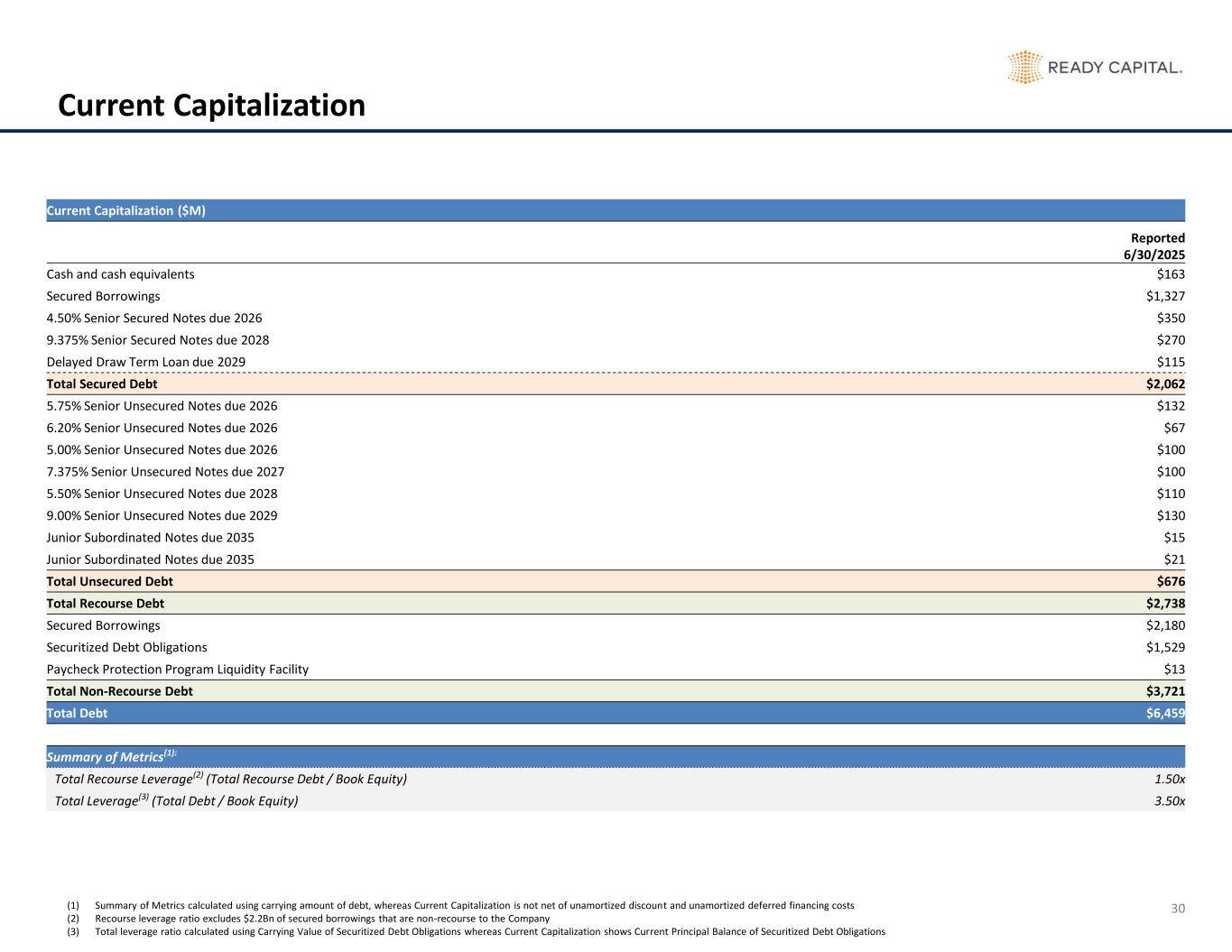30 Current Capitalization Current Capitalization ($M) Reported 6/30/2025 Cash and cash equivalents $163 Secured Borrowings $1,327 4.50% Senior Secured Notes due 2026 $350 9.375% Senior Secured Notes due 2028 $270 Delayed Draw Term Loan due 2029 $115 Total Secured Debt $2,062 5.75% Senior Unsecured Notes due 2026 $132 6.20% Senior Unsecured Notes due 2026 $67 5.00% Senior Unsecured Notes due 2026 $100 7.375% Senior Unsecured Notes due 2027 $100 5.50% Senior Unsecured Notes due 2028 $110 9.00% Senior Unsecured Notes due 2029 $130 Junior Subordinated Notes due 2035 $15 Junior Subordinated Notes due 2035 $21 Total Unsecured Debt $676 Total Recourse Debt $2,738 Secured Borrowings $2,180 Securitized Debt Obligations $1,529 Paycheck Protection Program Liquidity Facility $13 Total Non-Recourse Debt $3,721 Total Debt $6,459 Summary of Metrics(1): Total Recourse Leverage(2) (Total Recourse Debt / Book Equity) 1.50x Total Leverage(3) (Total Debt / Book Equity) 3.50x (1) Summary of Metrics calculated using carrying amount of debt, whereas Current Capitalization is not net of unamortized discount and unamortized deferred financing costs (2) Recourse leverage ratio excludes $2.2Bn of secured borrowings that are non-recourse to the Company (3) Total leverage ratio calculated using Carrying Value of Securitized Debt Obligations whereas Current Capitalization shows Current Principal Balance of Securitized Debt Obligations