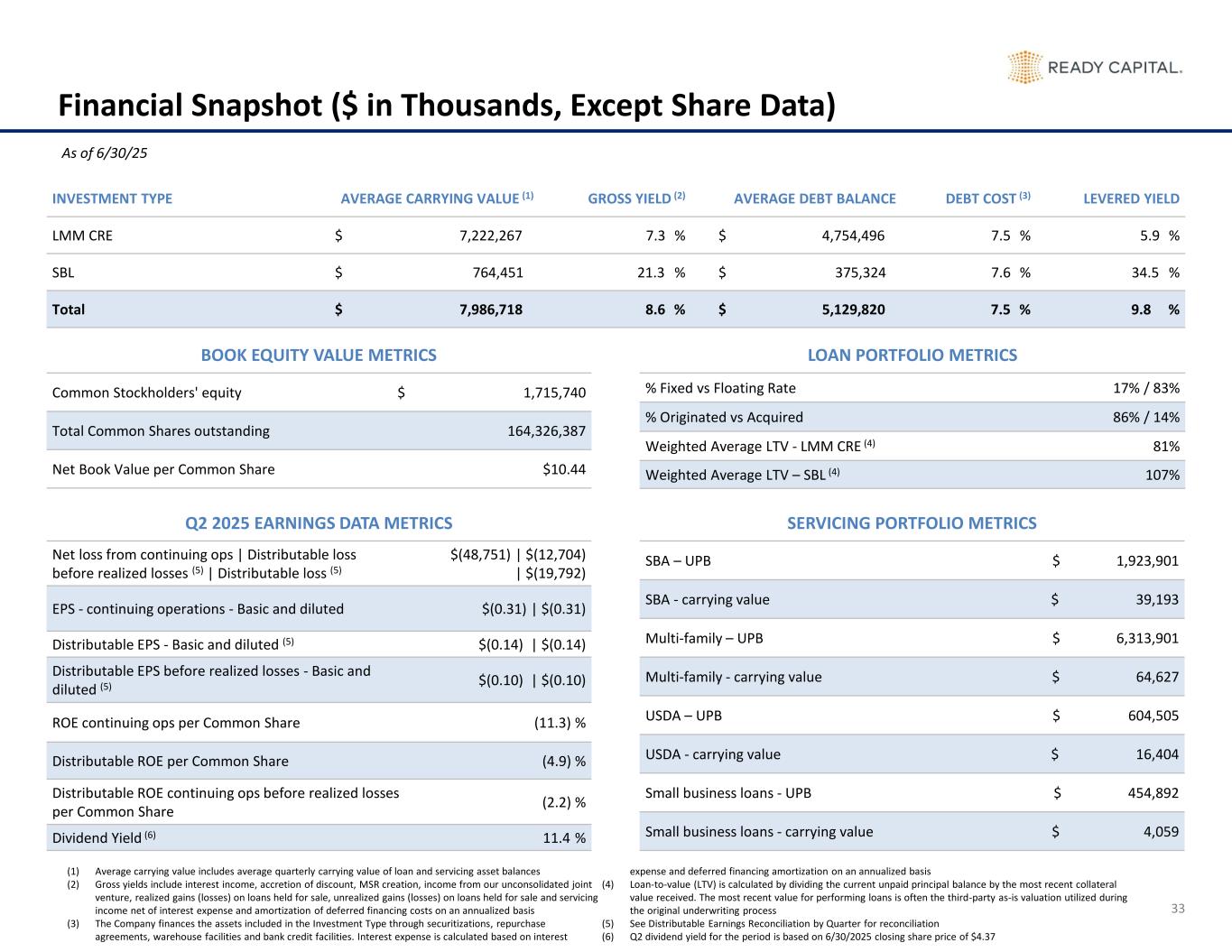 34 Balance Sheet by Quarter (In Thousands) 6/30/2024 9/30/2024 12/31/2024 3/31/2025 6/30/2025 Assets Cash and cash equivalents $ 226,286 $ 181,315 $ 143,803 $ 205,917 $ 162,935 Restricted cash 29,971 31,331 30,560 39,603 56,769 Loans, net 3,444,879 3,555,928 3,378,149 4,354,017 5,066,694 Loans, held for sale 532,511 320,082 241,626 528,726 632,784 Mortgage-backed securities 30,174 30,780 31,006 31,415 32,310 Investment in unconsolidated joint ventures 134,602 146,397 161,561 170,920 169,369 Derivative instruments 14,382 11,032 7,963 6,907 5,754 Servicing rights 119,768 127,989 128,440 129,814 124,283 Real estate owned, held for sale 187,883 166,697 193,437 199,910 199,790 Other assets 379,413 412,238 362,486 399,702 462,711 Assets of consolidated VIEs 6,250,570 5,794,720 5,175,295 3,723,738 2,395,396 Assets held for sale 423,894 474,535 287,595 185,782 - Total Assets $ 11,774,333 $ 11,253,044 $ 10,141,921 $ 9,976,451 $ 9,308,797 Liabilities Secured borrowings 2,311,969 2,184,280 2,035,176 2,713,415 3,506,670 Securitized debt obligations of consolidated VIEs, net 4,407,241 3,960,185 3,580,513 2,574,139 1,513,297 Senior secured notes and Corporate debt, net 1,184,311 1,206,159 1,333,112 1,488,666 1,387,029 Guaranteed loan financing 782,345 742,631 691,118 668,847 629,380 Contingent consideration 3,926 2,007 573 15,982 17,189 Derivative instruments 2,638 2,085 352 575 1,986 Dividends payable 53,119 44,602 43,168 23,929 22,917 Loan participations sold 89,532 99,737 95,578 98,128 101,863 Due to third parties 1,995 1,239 1,442 1,071 9,791 Accounts payable and other accrued liabilities 204,766 279,014 188,051 185,533 184,652 Liabilities held for sale 332,265 392,697 228,735 156,614 - Total Liabilities $ 9,374,107 $ 8,914,636 $ 8,197,818 $ 7,926,899 $ 7,374,774 Preferred stock Series C 8,361 8,361 8,361 8,361 8,361 Stockholders’ Equity Preferred stock 111,378 111,378 111,378 111,378 111,378 Common stock 17 17 17 17 17 Additional paid-in capital 2,287,684 2,292,229 2,250,291 2,302,101 2,267,540 Retained deficit (92,319) (146,003) (505,089) (450,276) (528,524) Accumulated other comprehensive loss (13,880) (24,232) (18,552) (21,673) (23,293) Total Ready Capital Corporation equity 2,292,880 2,233,389 1,838,045 1,941,547 1,827,118 Non-controlling interests 98,985 96,658 97,697 99,644 98,544 Total Stockholders’ Equity $ 2,391,865 $ 2,330,047 $ 1,935,742 $ 2,041,191 $ 1,925,662 Total Liabilities, Redeemable Preferred Stock, and Stockholders’ Equity $ 11,774,333 $ 11,253,044 $ 10,141,921 $ 9,976,451 $ 9,308,797 Book Value per Share $ 12.97 $ 12.59 $ 10.61 $ 10.61 $ 10.44