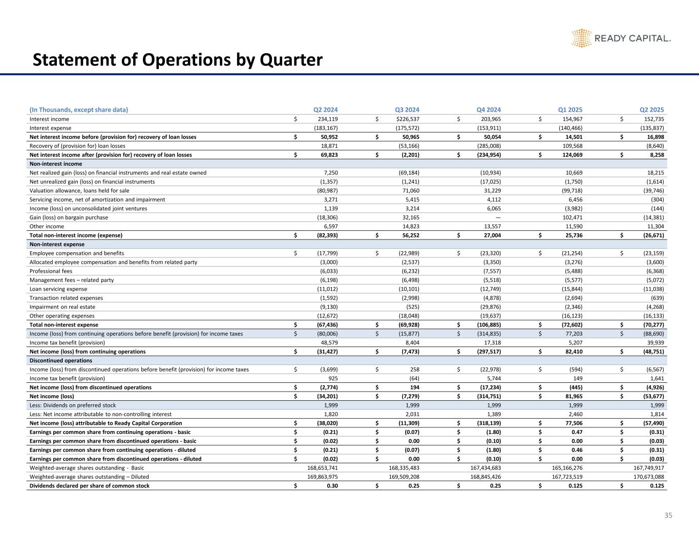 35 Statement of Operations by Quarter (In Thousands, except share data) Q2 2024 Q3 2024 Q4 2024 Q1 2025 Q2 2025 Interest income $ 234,119 $ $226,537 $ 203,965 $ 154,967 $ 152,735 Interest expense (183,167) (175,572) (153,911) (140,466) (135,837) Net interest income before (provision for) recovery of loan losses $ 50,952 $ 50,965 $ 50,054 $ 14,501 $ 16,898 Recovery of (provision for) loan losses 18,871 (53,166) (285,008) 109,568 (8,640) Net interest income after (provision for) recovery of loan losses $ 69,823 $ (2,201) $ (234,954) $ 124,069 $ 8,258 Non-interest income Net realized gain (loss) on financial instruments and real estate owned 7,250 (69,184) (10,934) 10,669 18,215 Net unrealized gain (loss) on financial instruments (1,357) (1,241) (17,025) (1,750) (1,614) Valuation allowance, loans held for sale (80,987) 71,060 31,229 (99,718) (39,746) Servicing income, net of amortization and impairment 3,271 5,415 4,112 6,456 (304) Income (loss) on unconsolidated joint ventures 1,139 3,214 6,065 (3,982) (144) Gain (loss) on bargain purchase (18,306) 32,165 — 102,471 (14,381) Other income 6,597 14,823 13,557 11,590 11,304 Total non-interest income (expense) $ (82,393) $ 56,252 $ 27,004 $ 25,736 $ (26,671) Non-interest expense Employee compensation and benefits $ (17,799) $ (22,989) $ (23,320) $ (21,254) $ (23,159) Allocated employee compensation and benefits from related party (3,000) (2,537) (3,350) (3,276) (3,600) Professional fees (6,033) (6,232) (7,557) (5,488) (6,368) Management fees – related party (6,198) (6,498) (5,518) (5,577) (5,072) Loan servicing expense (11,012) (10,101) (12,749) (15,844) (11,038) Transaction related expenses (1,592) (2,998) (4,878) (2,694) (639) Impairment on real estate (9,130) (525) (29,876) (2,346) (4,268) Other operating expenses (12,672) (18,048) (19,637) (16,123) (16,133) Total non-interest expense $ (67,436) $ (69,928) $ (106,885) $ (72,602) $ (70,277) Income (loss) from continuing operations before benefit (provision) for income taxes $ (80,006) $ (15,877) $ (314,835) $ 77,203 $ (88,690) Income tax benefit (provision) 48,579 8,404 17,318 5,207 39,939 Net income (loss) from continuing operations $ (31,427) $ (7,473) $ (297,517) $ 82,410 $ (48,751) Discontinued operations Income (loss) from discontinued operations before benefit (provision) for income taxes $ (3,699) $ 258 $ (22,978) $ (594) $ (6,567) Income tax benefit (provision) 925 (64) 5,744 149 1,641 Net income (loss) from discontinued operations $ (2,774) $ 194 $ (17,234) $ (445) $ (4,926) Net income (loss) $ (34,201) $ (7,279) $ (314,751) $ 81,965 $ (53,677) Less: Dividends on preferred stock 1,999 1,999 1,999 1,999 1,999 Less: Net income attributable to non-controlling interest 1,820 2,031 1,389 2,460 1,814 Net income (loss) attributable to Ready Capital Corporation $ (38,020) $ (11,309) $ (318,139) $ 77,506 $ (57,490) Earnings per common share from continuing operations - basic $ (0.21) $ (0.07) $ (1.80) $ 0.47 $ (0.31) Earnings per common share from discontinued operations - basic $ (0.02) $ 0.00 $ (0.10) $ 0.00 $ (0.03) Earnings per common share from continuing operations - diluted $ (0.21) $ (0.07) $ (1.80) $ 0.46 $ (0.31) Earnings per common share from discontinued operations - diluted $ (0.02) $ 0.00 $ (0.10) $ 0.00 $ (0.03) Weighted-average shares outstanding - Basic 168,653,741 168,335,483 167,434,683 165,166,276 167,749,917 Weighted-average shares outstanding – Diluted 169,863,975 169,509,208 168,845,426 167,723,519 170,673,088 Dividends declared per share of common stock $ 0.30 $ 0.25 $ 0.25 $ 0.125 $ 0.125