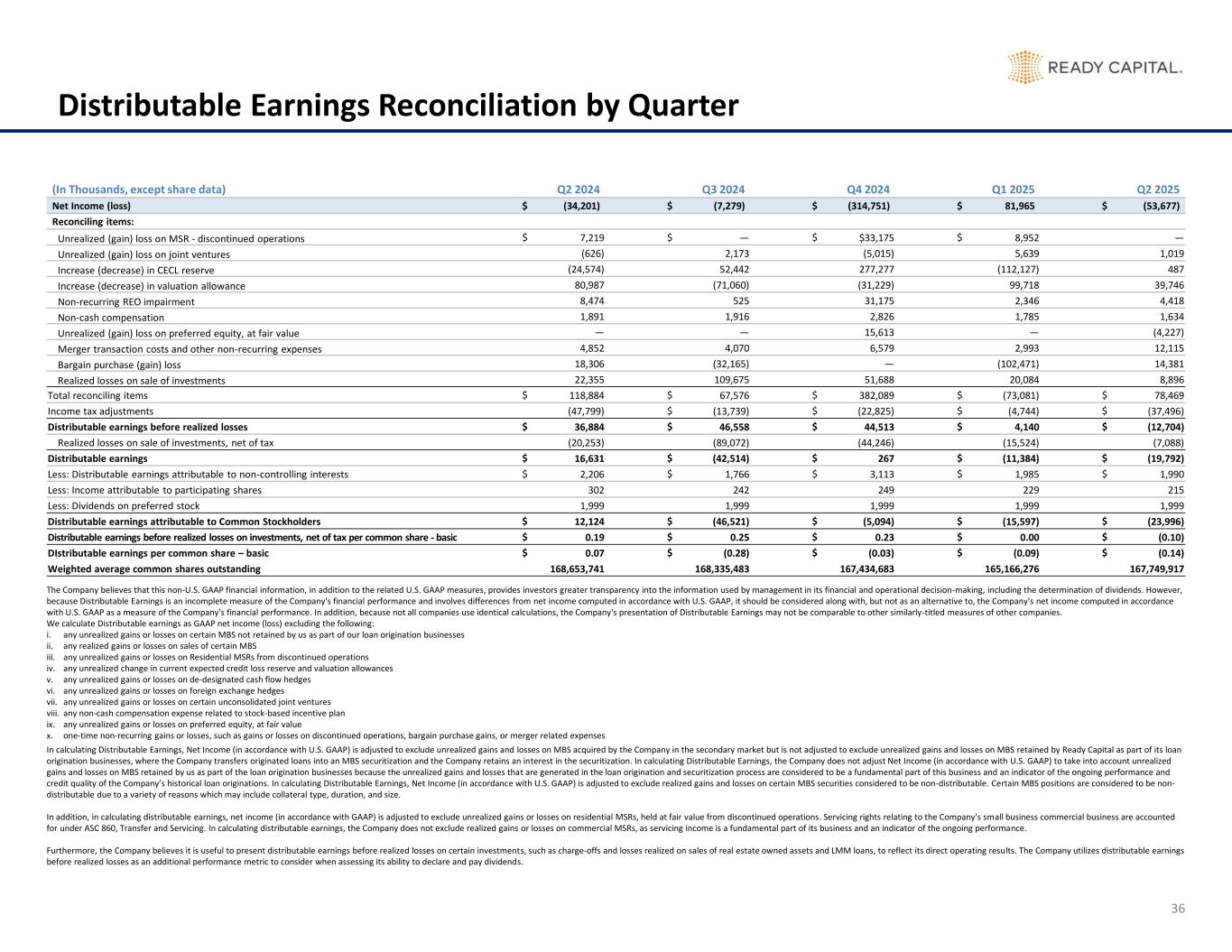 36 Distributable Earnings Reconciliation by Quarter (In Thousands, except share data) Q2 2024 Q3 2024 Q4 2024 Q1 2025 Q2 2025 Net Income (loss) $ (34,201) $ (7,279) $ (314,751) $ 81,965 $ (53,677) Reconciling items: Unrealized (gain) loss on MSR - discontinued operations $ 7,219 $ — $ $33,175 $ 8,952 — Unrealized (gain) loss on joint ventures (626) 2,173 (5,015) 5,639 1,019 Increase (decrease) in CECL reserve (24,574) 52,442 277,277 (112,127) 487 Increase (decrease) in valuation allowance 80,987 (71,060) (31,229) 99,718 39,746 Non-recurring REO impairment 8,474 525 31,175 2,346 4,418 Non-cash compensation 1,891 1,916 2,826 1,785 1,634 Unrealized (gain) loss on preferred equity, at fair value — — 15,613 — (4,227) Merger transaction costs and other non-recurring expenses 4,852 4,070 6,579 2,993 12,115 Bargain purchase (gain) loss 18,306 (32,165) — (102,471) 14,381 Realized losses on sale of investments 22,355 109,675 51,688 20,084 8,896 Total reconciling items $ 118,884 $ 67,576 $ 382,089 $ (73,081) $ 78,469 Income tax adjustments (47,799) $ (13,739) $ (22,825) $ (4,744) $ (37,496) Distributable earnings before realized losses $ 36,884 $ 46,558 $ 44,513 $ 4,140 $ (12,704) Realized losses on sale of investments, net of tax (20,253) (89,072) (44,246) (15,524) (7,088) Distributable earnings $ 16,631 $ (42,514) $ 267 $ (11,384) $ (19,792) Less: Distributable earnings attributable to non-controlling interests $ 2,206 $ 1,766 $ 3,113 $ 1,985 $ 1,990 Less: Income attributable to participating shares 302 242 249 229 215 Less: Dividends on preferred stock 1,999 1,999 1,999 1,999 1,999 Distributable earnings attributable to Common Stockholders $ 12,124 $ (46,521) $ (5,094) $ (15,597) $ (23,996) Distributable earnings before realized losses on investments, net of tax per common share - basic $ 0.19 $ 0.25 $ 0.23 $ 0.00 $ (0.10) DIstributable earnings per common share – basic $ 0.07 $ (0.28) $ (0.03) $ (0.09) $ (0.14) Weighted average common shares outstanding 168,653,741 168,335,483 167,434,683 165,166,276 167,749,917 The Company believes that this non-U.S. GAAP financial information, in addition to the related U.S. GAAP measures, provides investors greater transparency into the information used by management in its financial and operational decision-making, including the determination of dividends. However, because Distributable Earnings is an incomplete measure of the Company's financial performance and involves differences from net income computed in accordance with U.S. GAAP, it should be considered along with, but not as an alternative to, the Company's net income computed in accordance with U.S. GAAP as a measure of the Company's financial performance. In addition, because not all companies use identical calculations, the Company's presentation of Distributable Earnings may not be comparable to other similarly-titled measures of other companies. We calculate Distributable earnings as GAAP net income (loss) excluding the following: i. any unrealized gains or losses on certain MBS not retained by us as part of our loan origination businesses ii. any realized gains or losses on sales of certain MBS iii. any unrealized gains or losses on Residential MSRs from discontinued operations iv. any unrealized change in current expected credit loss reserve and valuation allowances v. any unrealized gains or losses on de-designated cash flow hedges vi. any unrealized gains or losses on foreign exchange hedges vii. any unrealized gains or losses on certain unconsolidated joint ventures viii. any non-cash compensation expense related to stock-based incentive plan ix. any unrealized gains or losses on preferred equity, at fair value x. one-time non-recurring gains or losses, such as gains or losses on discontinued operations, bargain purchase gains, or merger related expenses In calculating Distributable Earnings, Net Income (in accordance with U.S. GAAP) is adjusted to exclude unrealized gains and losses on MBS acquired by the Company in the secondary market but is not adjusted to exclude unrealized gains and losses on MBS retained by Ready Capital as part of its loan origination businesses, where the Company transfers originated loans into an MBS securitization and the Company retains an interest in the securitization. In calculating Distributable Earnings, the Company does not adjust Net Income (in accordance with U.S. GAAP) to take into account unrealized gains and losses on MBS retained by us as part of the loan origination businesses because the unrealized gains and losses that are generated in the loan origination and securitization process are considered to be a fundamental part of this business and an indicator of the ongoing performance and credit quality of the Company’s historical loan originations. In calculating Distributable Earnings, Net Income (in accordance with U.S. GAAP) is adjusted to exclude realized gains and losses on certain MBS securities considered to be non-distributable. Certain MBS positions are considered to be non- distributable due to a variety of reasons which may include collateral type, duration, and size. In addition, in calculating distributable earnings, net income (in accordance with GAAP) is adjusted to exclude unrealized gains or losses on residential MSRs, held at fair value from discontinued operations. Servicing rights relating to the Company's small business commercial business are accounted for under ASC 860, Transfer and Servicing. In calculating distributable earnings, the Company does not exclude realized gains or losses on commercial MSRs, as servicing income is a fundamental part of its business and an indicator of the ongoing performance. Furthermore, the Company believes it is useful to present distributable earnings before realized losses on certain investments, such as charge-offs and losses realized on sales of real estate owned assets and LMM loans, to reflect its direct operating results. The Company utilizes distributable earnings befor
