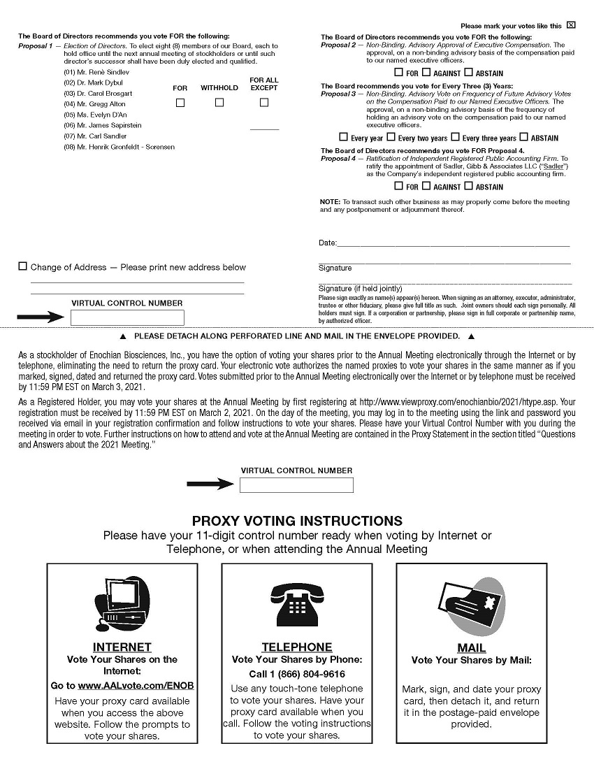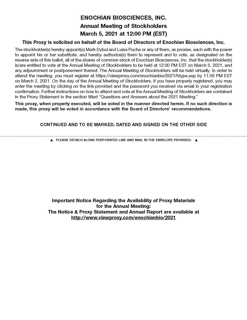 This Amendment No. 1 to Schedule 14A (this “Amendment”) is being filed solely to amend and replace the sample proxy card included in the Definitive Proxy Statement filed by Enochian Biosciences Inc. (the “Company”) with the Securities and Exchange Commission on February 3, 2021 (the “Proxy Statement”). After filing the Proxy Statement, the Company discovered that, due to a clerical error, an incorrect version of the sample proxy card was inadvertently filed with the Proxy Statement.
