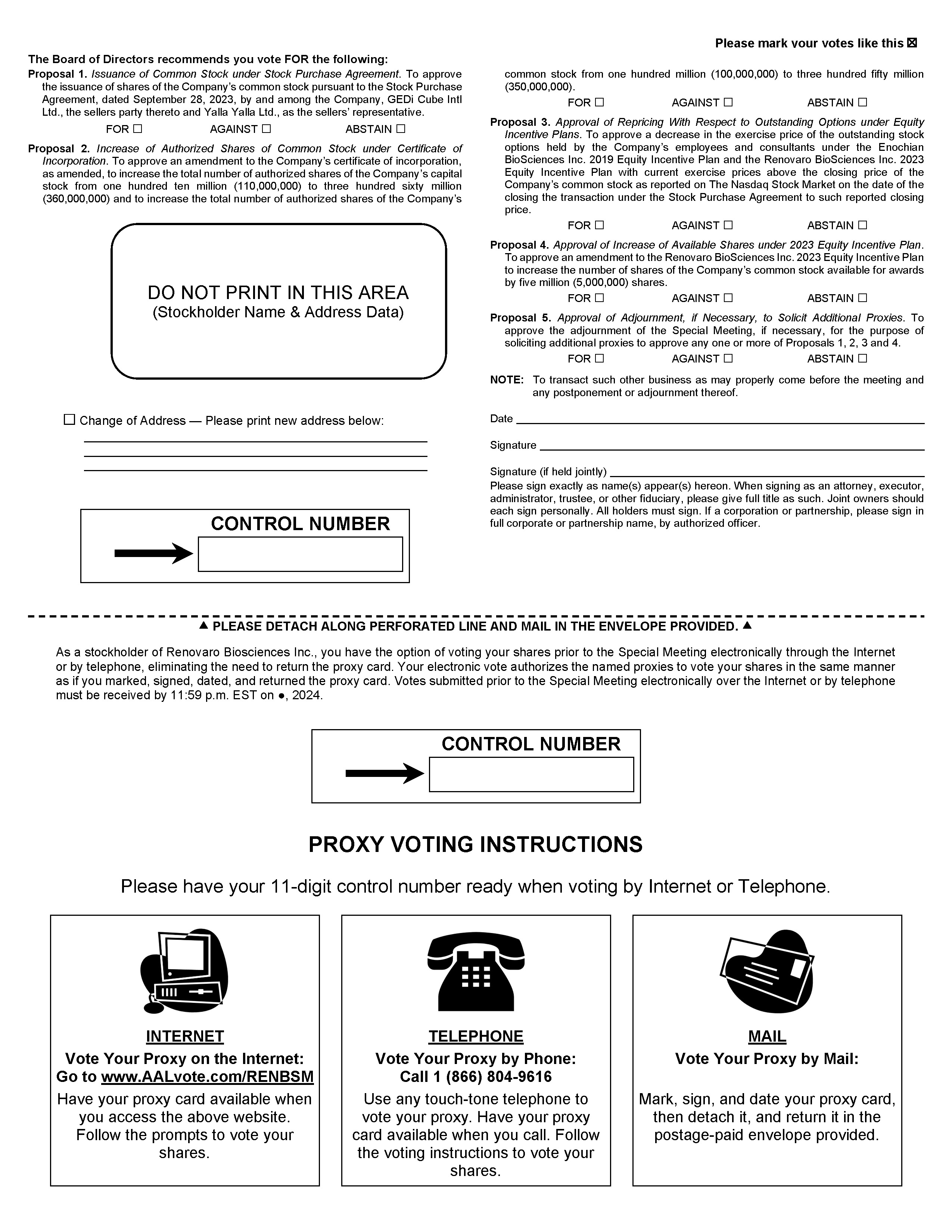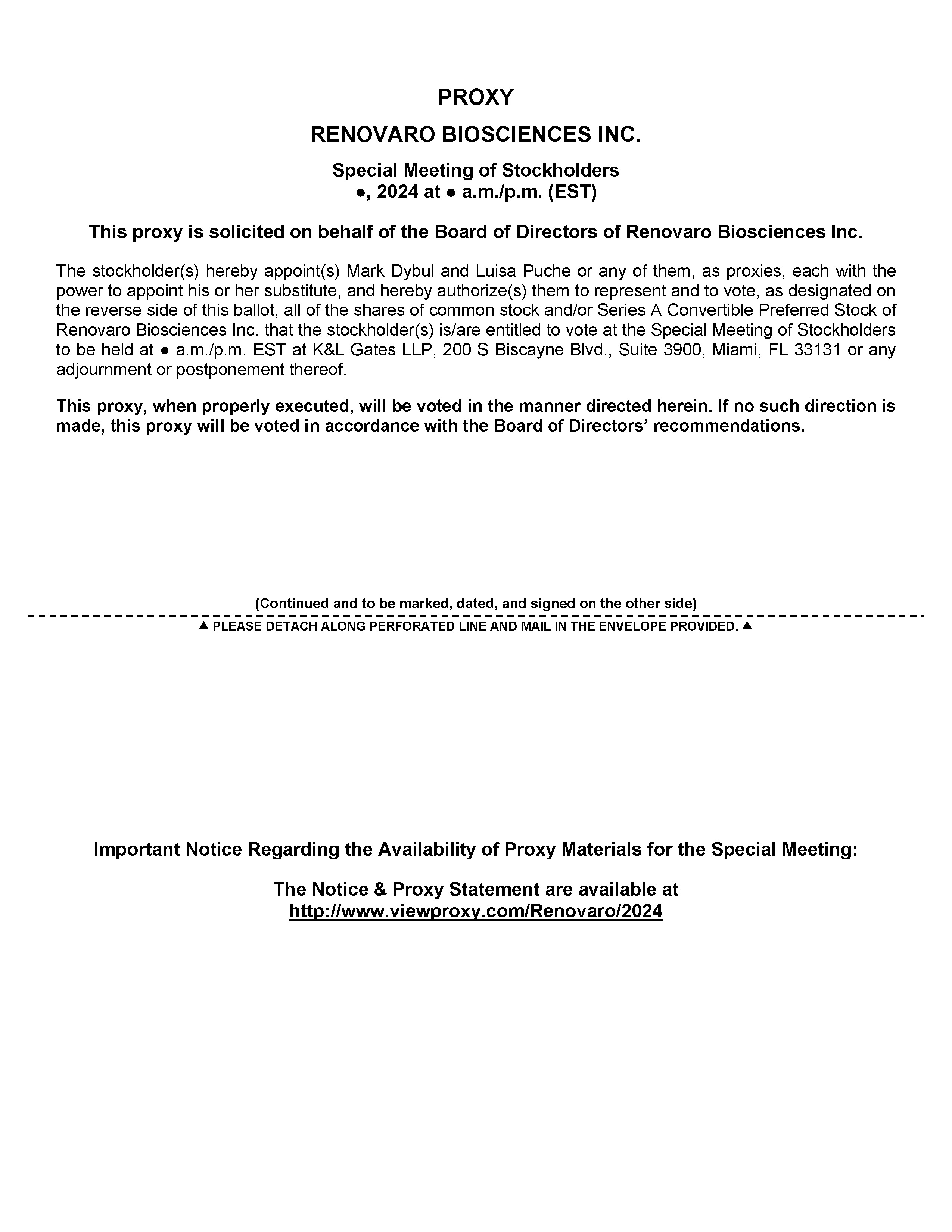 You are invited to attend a special meeting of the stockholders of Renovaro Biosciences Inc., a Delaware corporation (“Renovaro”), which will be held on , 2024, at , [a.m./p.m.], Eastern Standard Time (the “Special Meeting”), at K&L Gates LLP, 200 S Biscayne Blvd., Suite 3900, Miami, FL 33131, unless postponed or adjourned to a later date. The Special Meeting is an important meeting that will impact your investment in Renovaro.