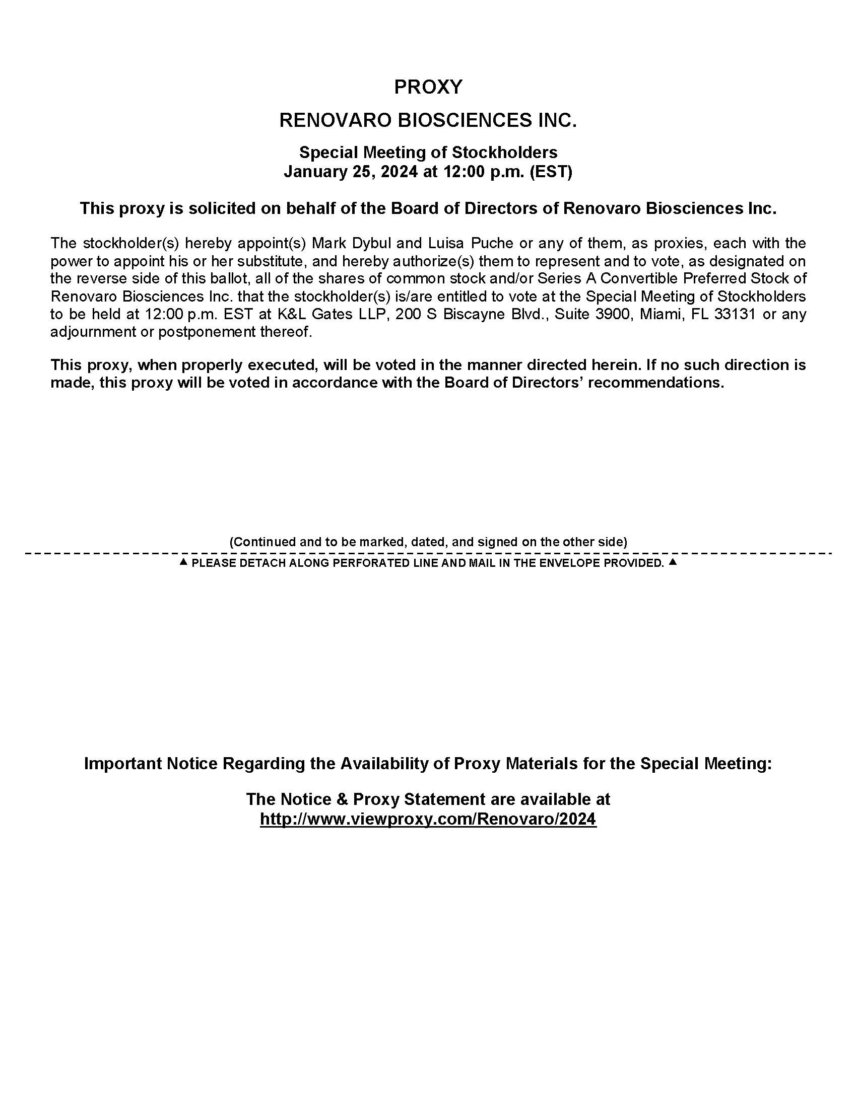 You are invited to attend a special meeting of the stockholders of Renovaro Biosciences Inc., a Delaware corporation (“Renovaro”), which will be held on Thursday, January 25, 2024, at 12:00 p.m., Eastern Standard Time (the “Special Meeting”), at K&L Gates LLP, 200 S Biscayne Blvd., Suite 3900, Miami, FL 33131, unless postponed or adjourned to a later date. The Special Meeting is an important meeting that will impact your investment in Renovaro.