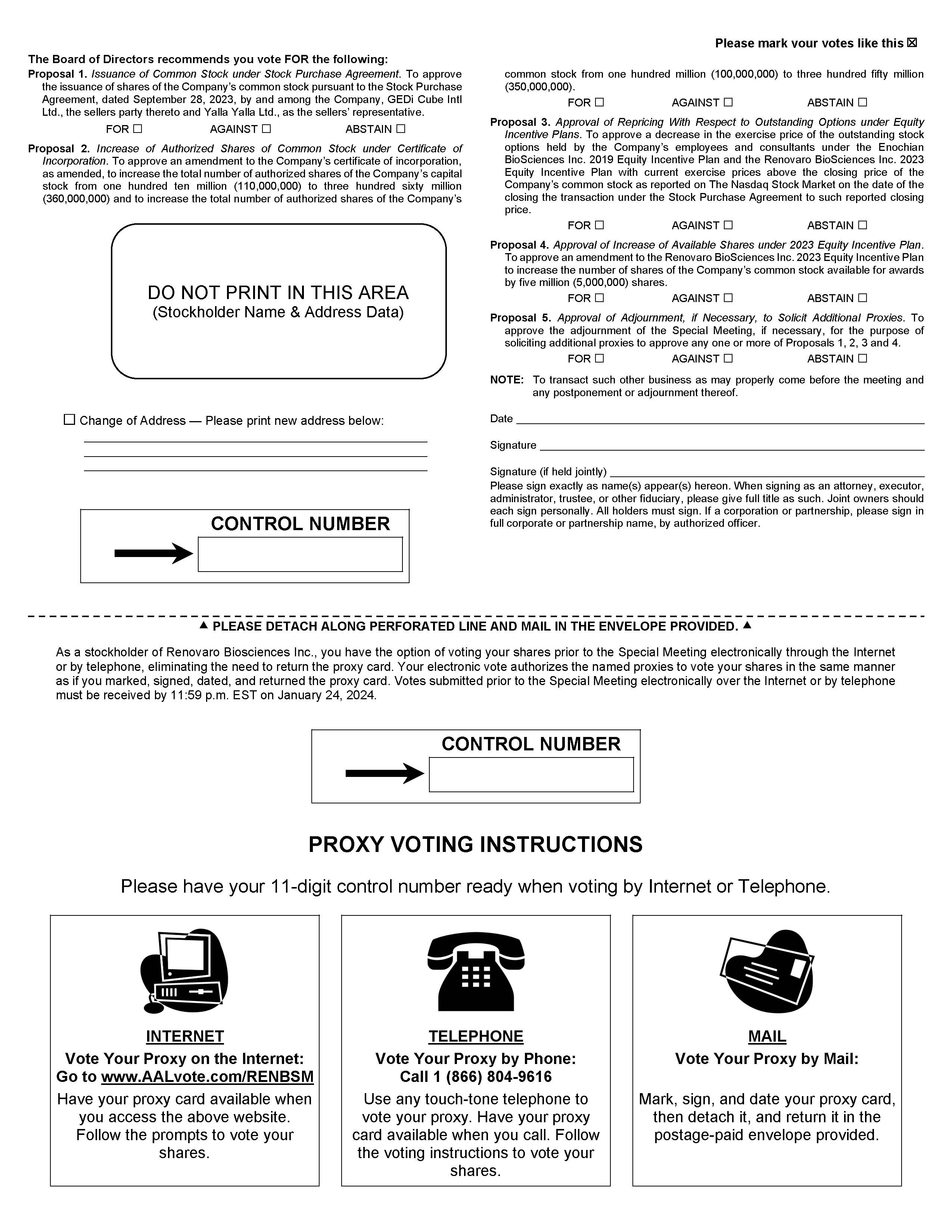| ● | To approve a decrease in the exercise price of the outstanding stock options held by Renovaro’s employees and consultants granted pursuant to the Enochian BioSciences Inc. 2019 Equity Incentive Plan (the “2019 Plan”) and the Renovaro Biosciences Inc. 2023 Equity Incentive Plan (the “2023 Plan” and, together with the 2019 Plan, the “Plans”) with current exercise prices above the closing price of the Common Stock as reported on Nasdaq on the date of the closing of the Transaction to such reported closing price, as required by Nasdaq Listing Rule 5635 and the terms of the Plans (the “Repricing Proposal”); |
