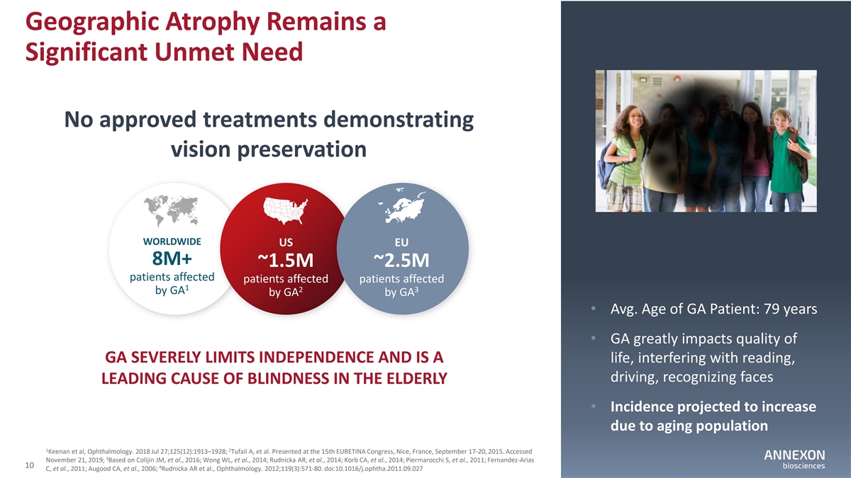 Geographic Atrophy Remains a Significant Unmet Need No approved treatments demonstrating vision preservation WORLDWIDE US EU 8M+ ~1.5M ~2.5M patients affected patients affected patients affected 1 2 3 by GA by GA by GA • Avg. Age of GA Patient: 79 years • GA greatly impacts quality of GA SEVERELY LIMITS INDEPENDENCE AND IS A life, interfering with reading, driving, recognizing faces LEADING CAUSE OF BLINDNESS IN THE ELDERLY • Incidence projected to increase due to aging population 1 2 Keenan et al, Ophthalmology. 2018 Jul 27;125(12):1913–1928; Tufail A, et al. Presented at the 15th EURETINA Congress, Nice, France, September 17‐ 20, 2015. Accessed 3 November 21, 2019; Based on Colijin JM, et al., 2016; Wong WL, et al., 2014; Rudnicka AR, et al., 2014; Korb CA, et al., 2014; Piermarocchi S, et al., 2011; Fernandez‐ Arias 10 4 C, et al., 2011; Augood CA, et al., 2006; Rudnicka AR et al., Ophthalmology. 2012;119(3):571‐ 80. doi:10.1016/j.ophtha.2011.09.027