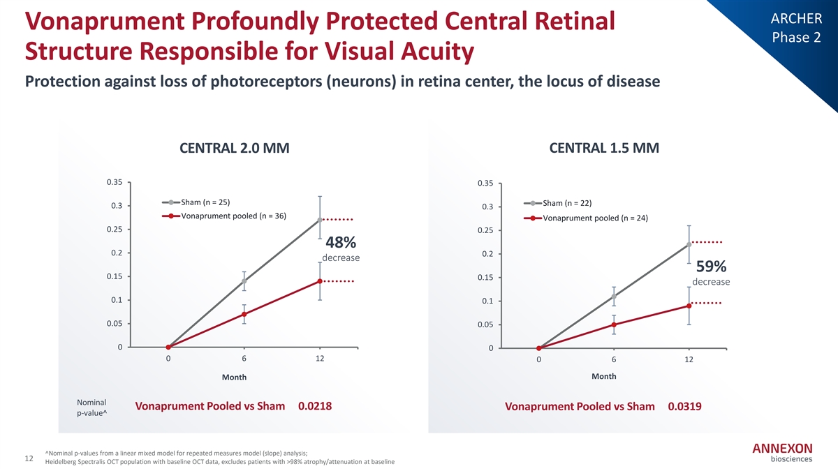 ARCHER Vonaprument Profoundly Protected Central Retinal Phase 2 Structure Responsible for Visual Acuity Protection against loss of photoreceptors (neurons) in retina center, the locus of disease CENTRAL 2.0 MM CENTRAL 1.5 MM 0.35 0.35 Sham (n = 25) Sham (n = 22) 0.3 0.3 Vonaprument pooled (n = 36) Vonaprument pooled (n = 24) 0.25 0.25 48% 0.2 0.2 decrease 59% 0.15 0.15 decrease 0.1 0.1 0.05 0.05 0 0 0 6 12 0 6 12 Month Month Nominal Vonaprument Pooled vs Sham 0.0218 Vonaprument Pooled vs Sham 0.0319 p‐ value^ ^Nominal p‐ values from a linear mixed model for repeated measures model (slope) analysis; 12 Heidelberg Spectralis OCT population with baseline OCT data, excludes patients with >98% atrophy/attenuation at baseline