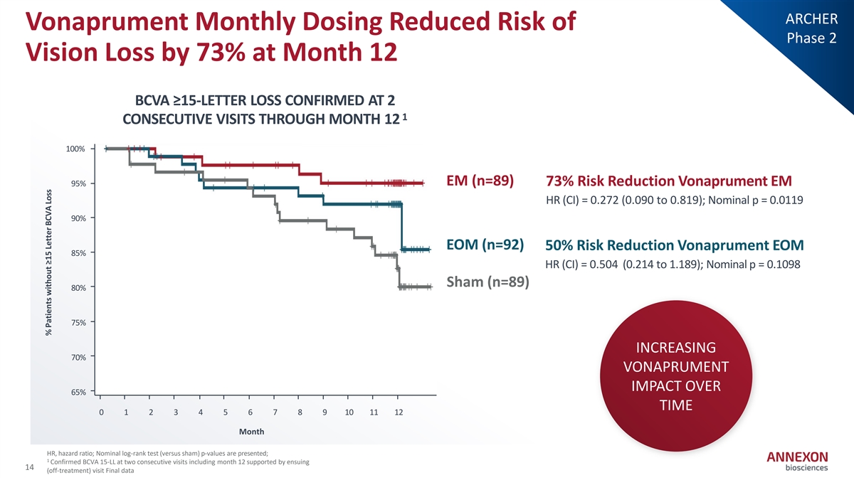 ARCHER Vonaprument Monthly Dosing Reduced Risk of Phase 2 Vision Loss by 73% at Month 12 BCVA ≥15-LETTER LOSS CONFIRMED AT 2 1 CONSECUTIVE VISITS THROUGH MONTH 12 100% EM (n=89) 73% Risk Reduction Vonaprument EM 95% HR (CI) = 0.272 (0.090 to 0.819); Nominal p = 0.0119 90% EOM (n=92) 50% Risk Reduction Vonaprument EOM 85% HR (CI) = 0.504 (0.214 to 1.189); Nominal p = 0.1098 Sham (n=89) 80% 75% INCREASING 70% VONAPRUMENT IMPACT OVER 65% TIME 0 1 2 3 4 5 6 7 8 9 10 11 12 Month HR, hazard ratio; Nominal log‐ rank test (versus sham) p‐ values are presented; 1 Confirmed BCVA 15‐ LL at two consecutive visits including month 12 supported by ensuing 14 (off‐ treatment) visit Final data % Patients without ≥15 Letter BCVA Loss