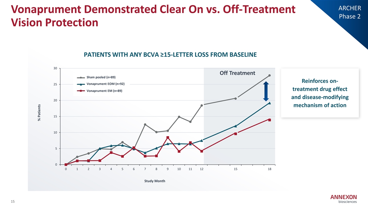 ARCHER Vonaprument Demonstrated Clear On vs. Off-Treatment Phase 2 Vision Protection PATIENTS WITH ANY BCVA ≥15-LETTER LOSS FROM BASELINE 30 Off Treatment Sham pooled (n=89) Sham Pooled (n=89) Reinforces on- A V N oX n007 E aprum OM en ( tn E = O 92) M (n=92) 25 treatment drug effect ANX007 EM (n=89) Vonaprument EM (n=89) and disease-modifying 20 mechanism of action 15 10 5 0 0 1 2 3 4 5 6 7 8 9 10 11 12 15 18 Study Month 15 % Patients
