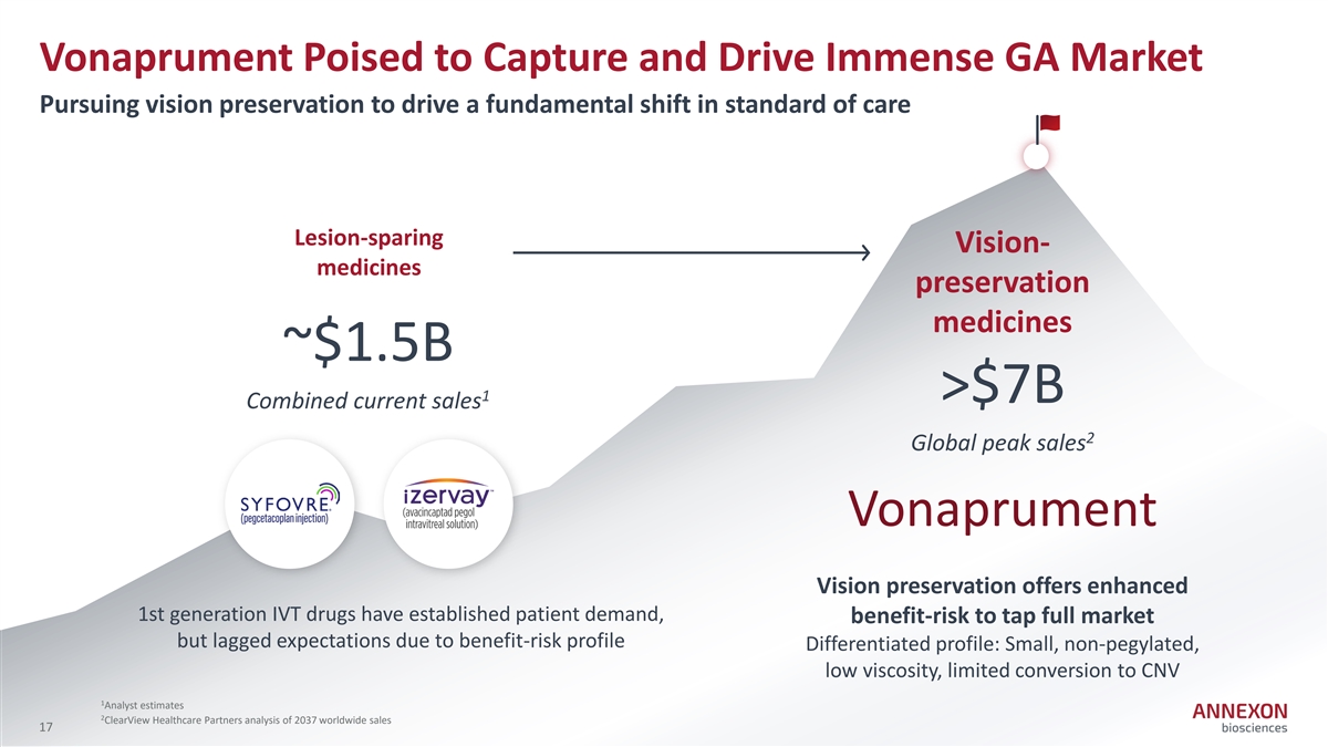 ARCHER II Phase 3 Phase 3 Pivotal Study: Well-Informed Design and Powering Leverages Phase 2 learnings and enriched for patients with higher risk of vision loss Primary analysis: Treatment masked 15 months through 24 months Vonaprument (ANX007) Monthly 5.0 mg/eye N=659 Randomized 2:1 Sham Sites: North America, Europe, AUS, NZ GLOBAL REGISTRATION PATH PRIMARY ENDPOINT SECONDARY ENDPOINT Prime designation in EU Proportion of patients who experience a Safety, LLVA, EZ integrity 1 Selected by EMA for PDC program BCVA ≥15‐ Letter Loss confirmed at two FDA Fast Track designation consecutive visits 1 Product Development Coordinator 16